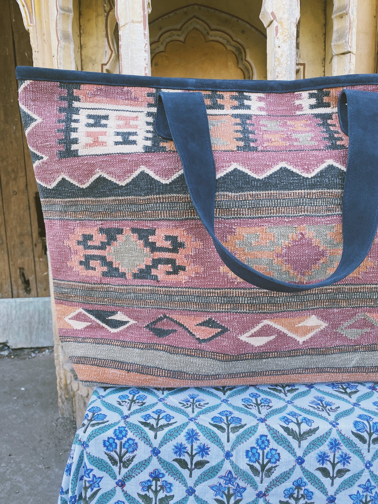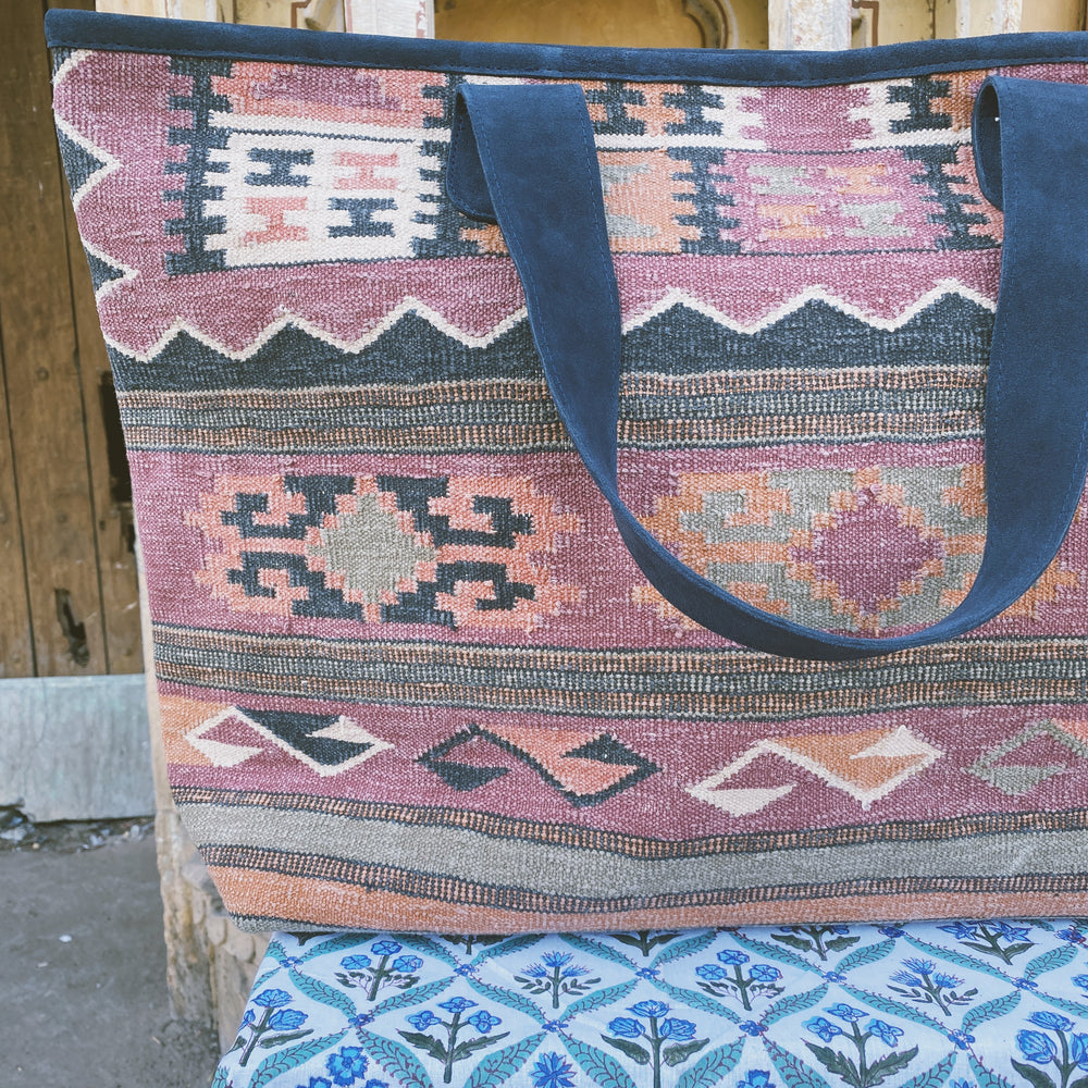 Dhurries are traditionally handwoven cotton rugs from India. The hand weave makes the bags strong, durable and reliable. The dhurries have unique designs inspired by the state of origin such as multicolor stripes, one of the most popular patterns.