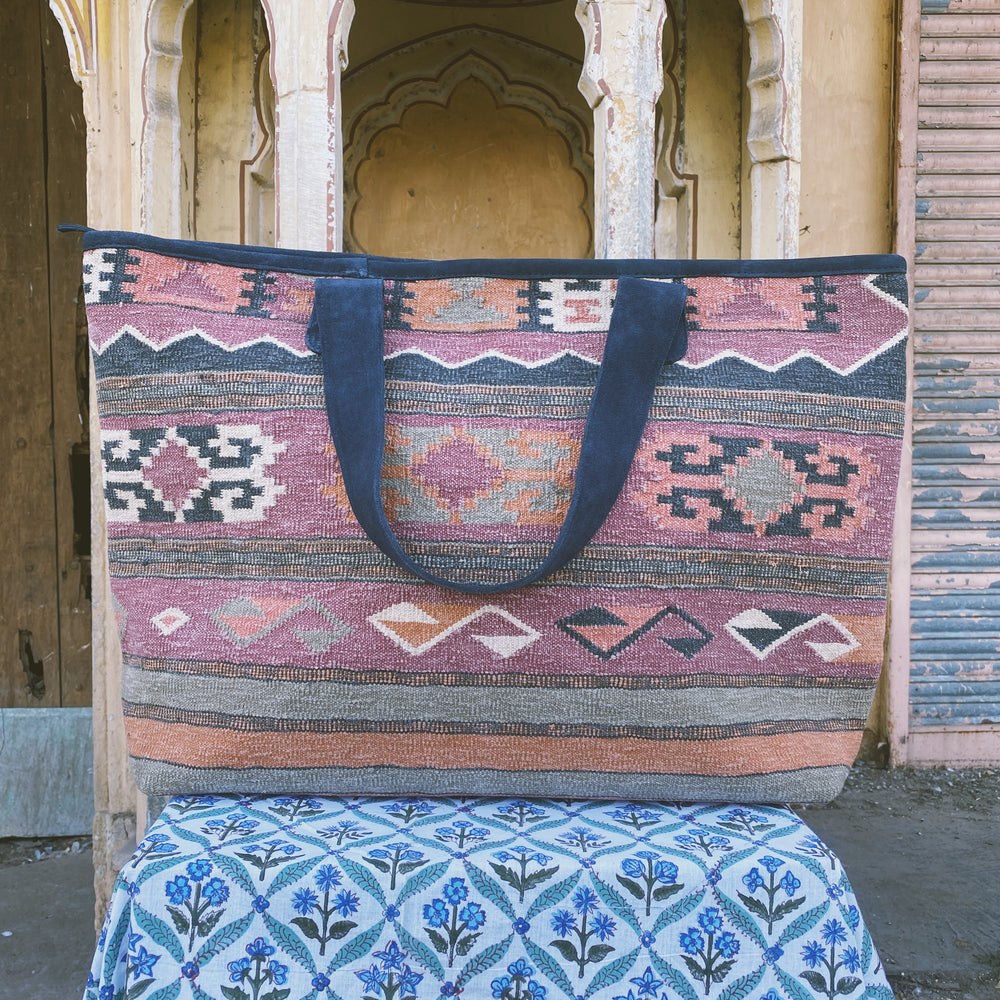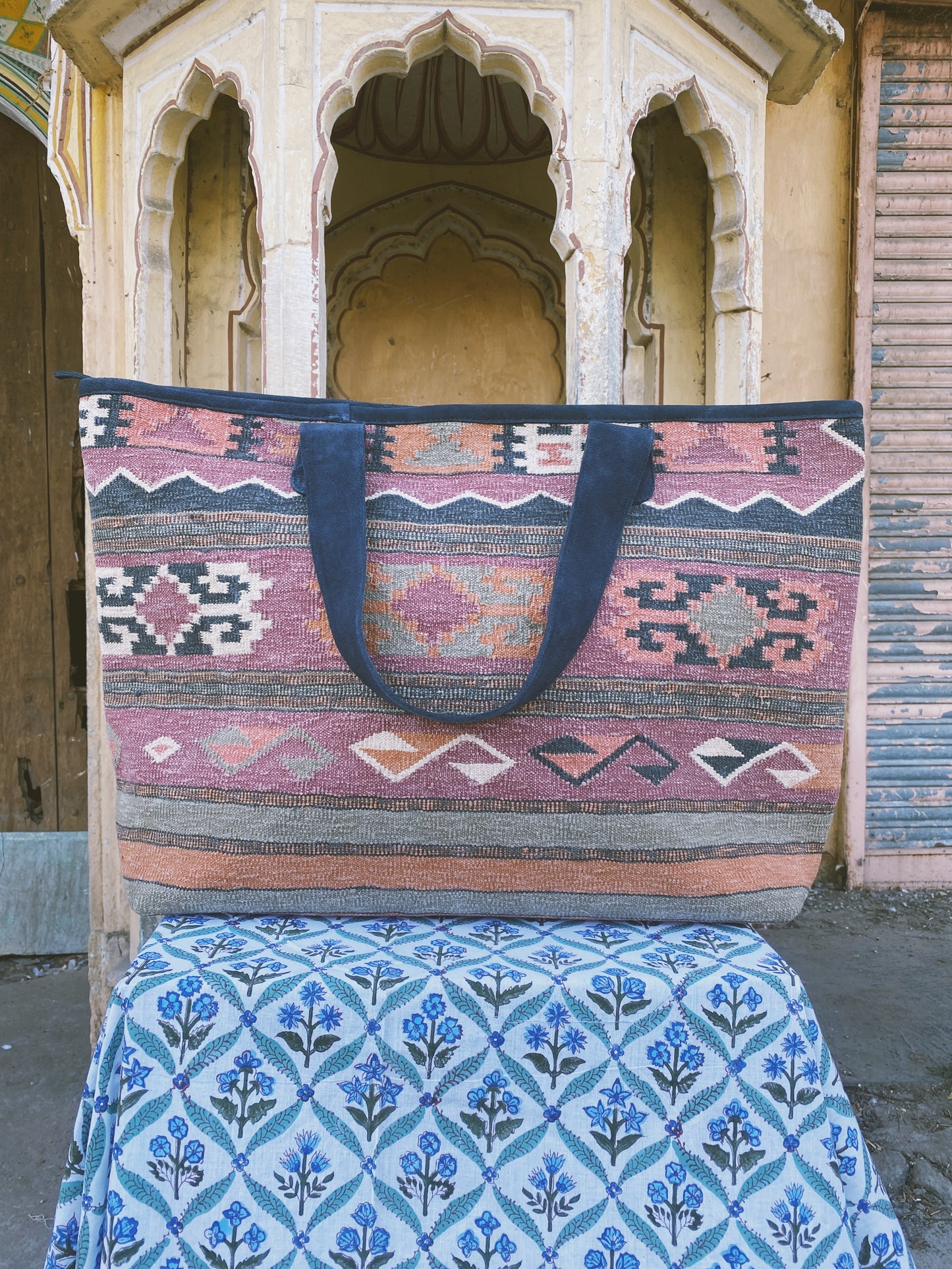 This is a one of a kind bag from our new limited edition collection of vintage dhurrie weekend bags. These original and practical weekend bags are perfect for an overnight stay, a weekend getaway, a family trip to the beach, or as a decent sized baby bag. We also used ours as a hospital bag when our baby was born as it is the perfect size for both mummy and baby items for a few nights.