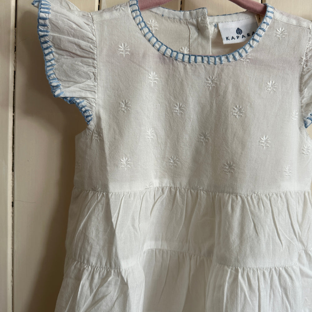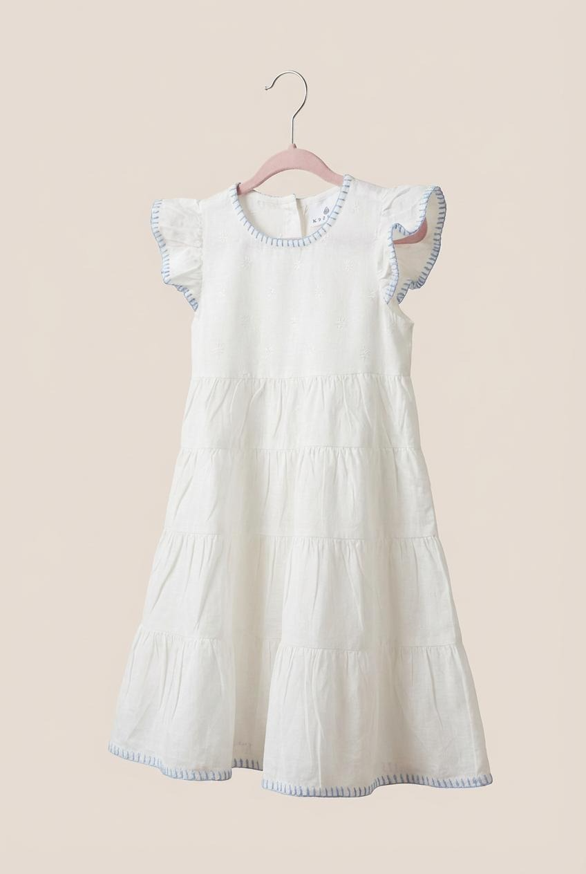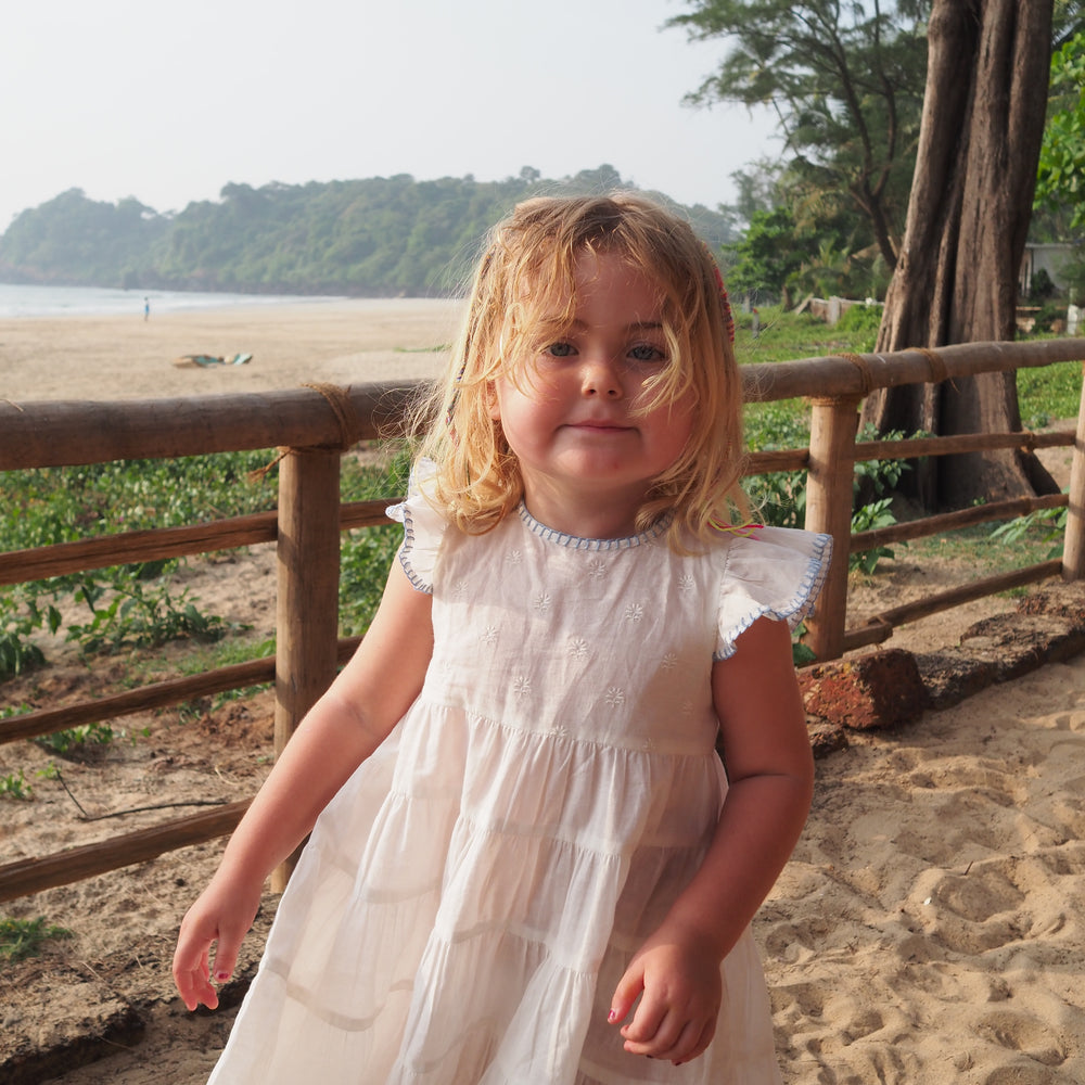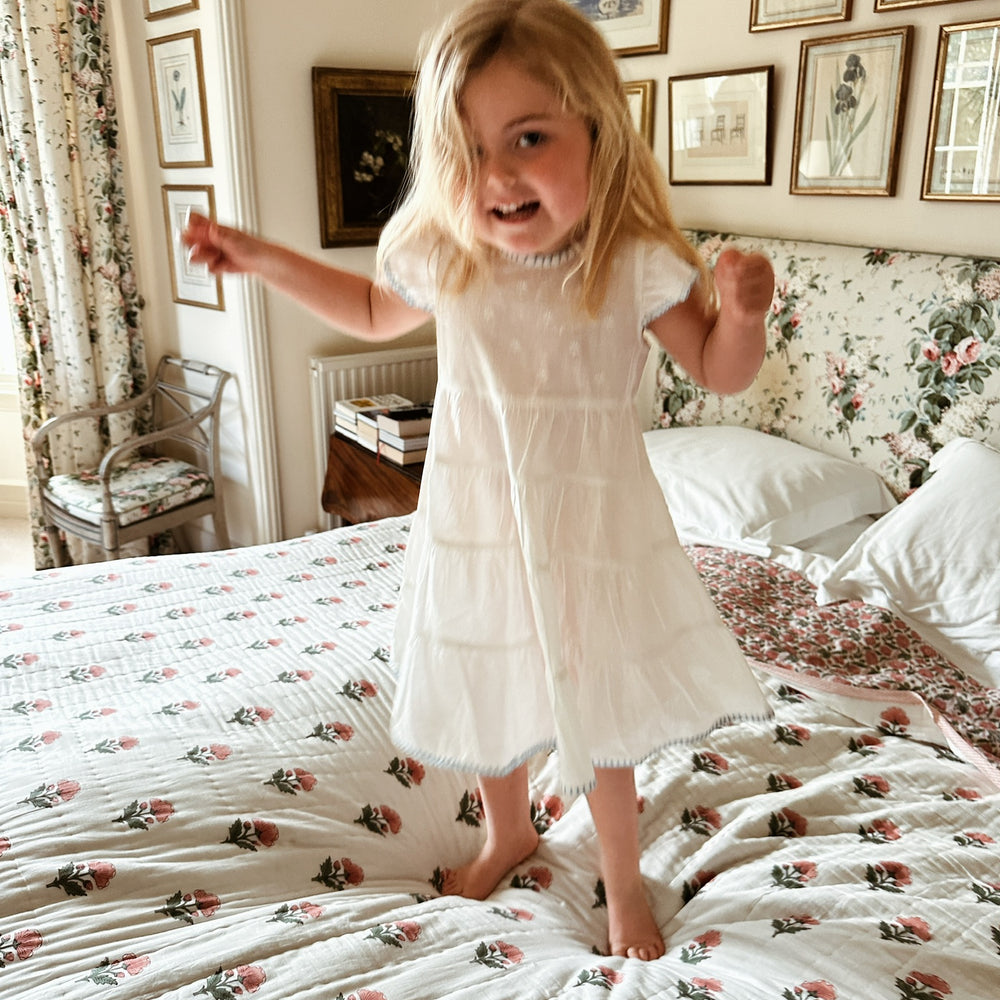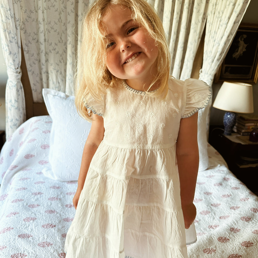 Our new Amba girls’ nighties are designed for both sleep and everyday adventures. Made from BCI cotton, this tiered style features delicate embroidery and a charming blanket stitch trim.