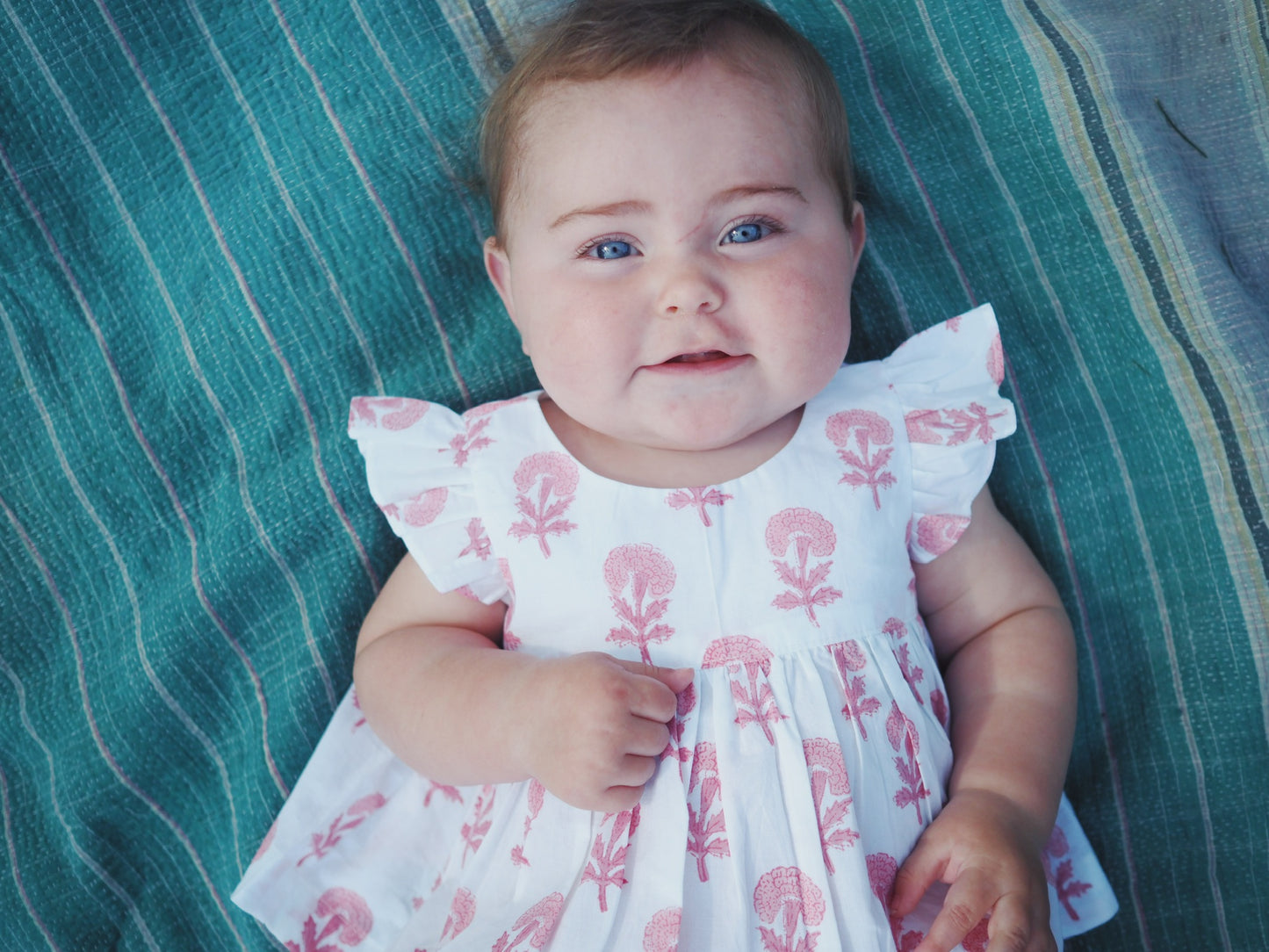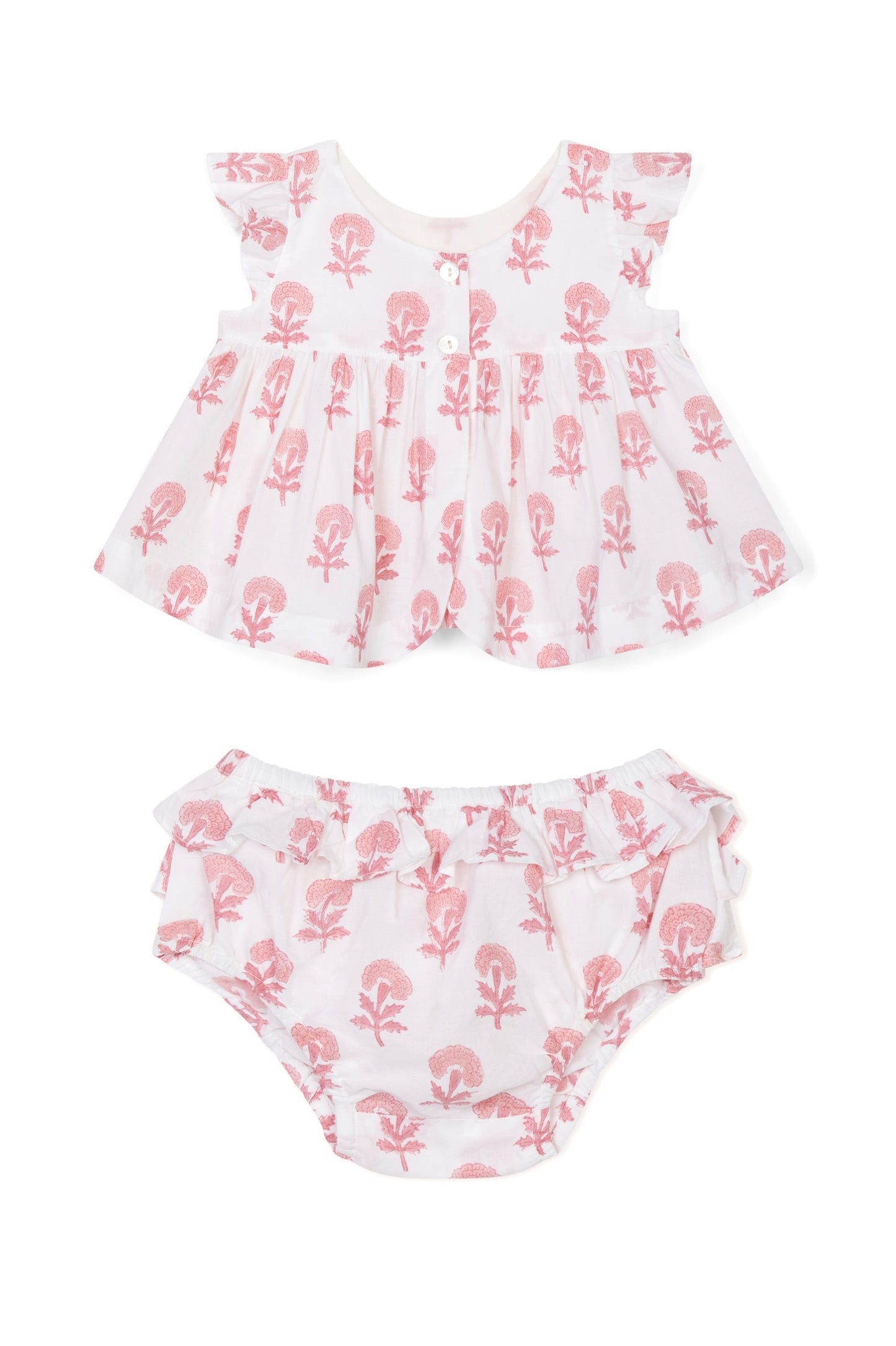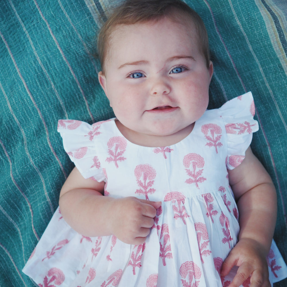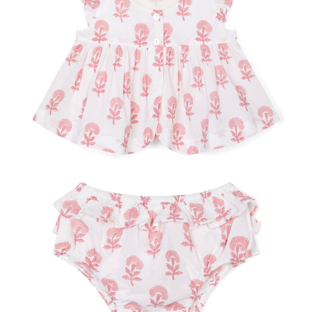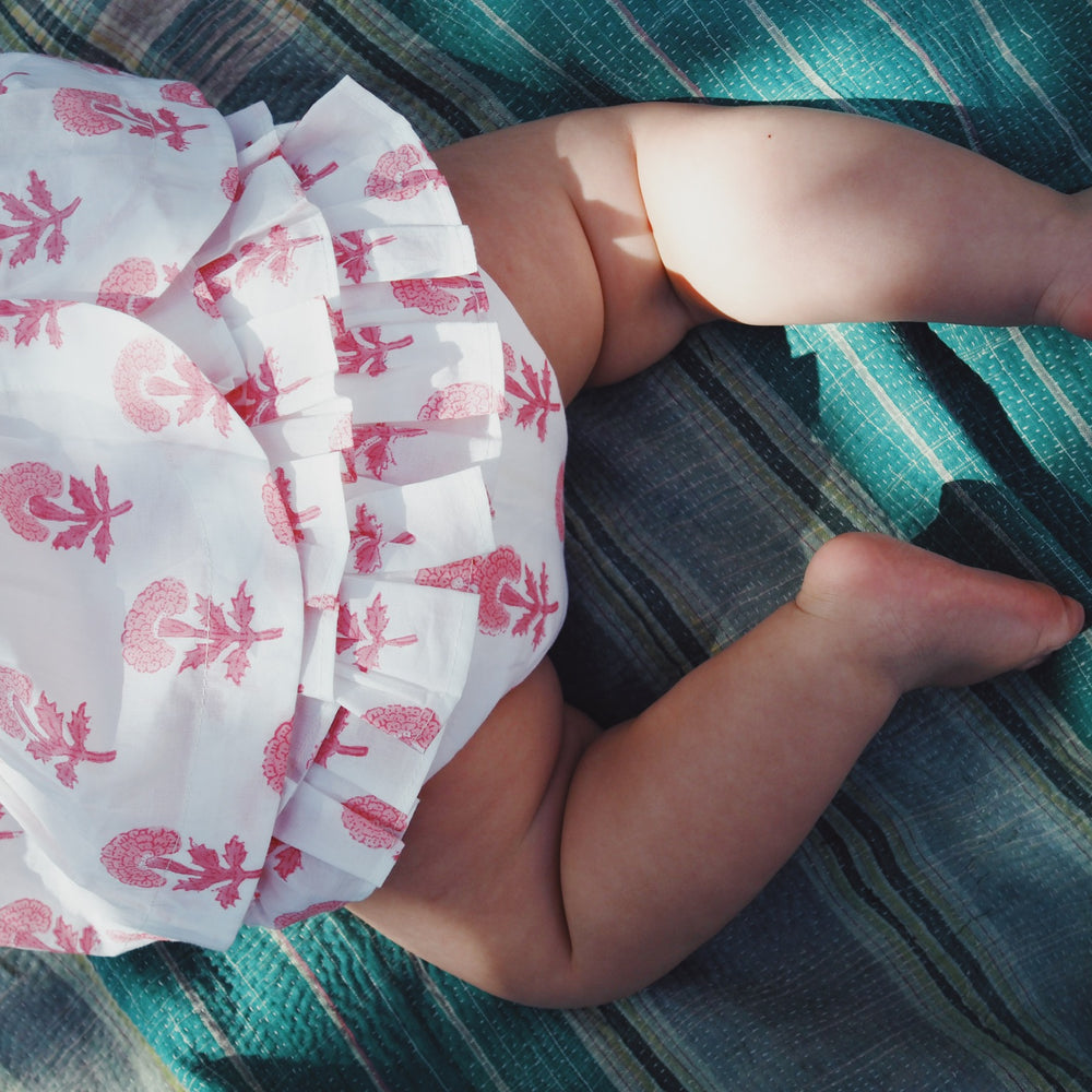 This organic cotton bloomers and top set is the sweetest little outfit you will find around town and country-life this summer! Let your little ones be cool and comfy in the garden or on holiday in this very pretty design. The top buttons up at the back is great under a pair of dungarees or over leggings and with the bloomers on the beach or sitting in the garden. The frill bottoms are perfect for under dresses, running / crawling around the garden and just over nappies on a hot day. The set comes in three different block printed colour patterns (two pink patterns and one blue pattern).