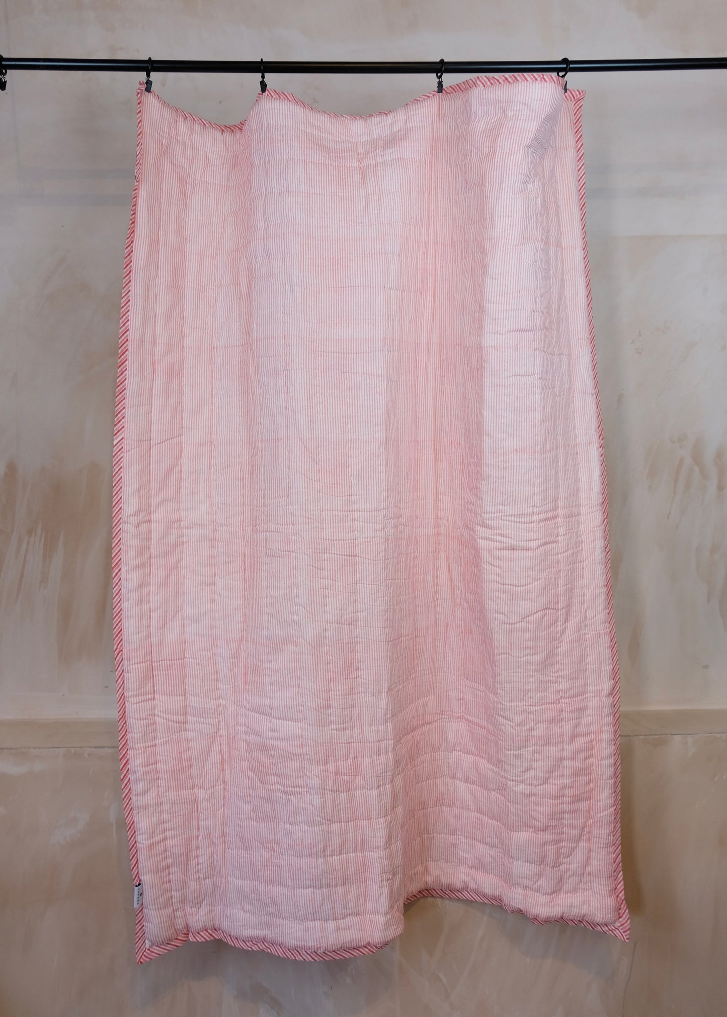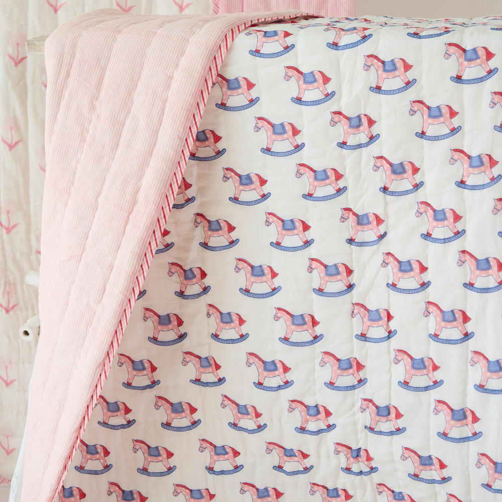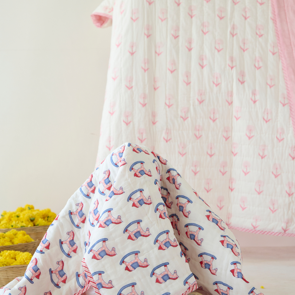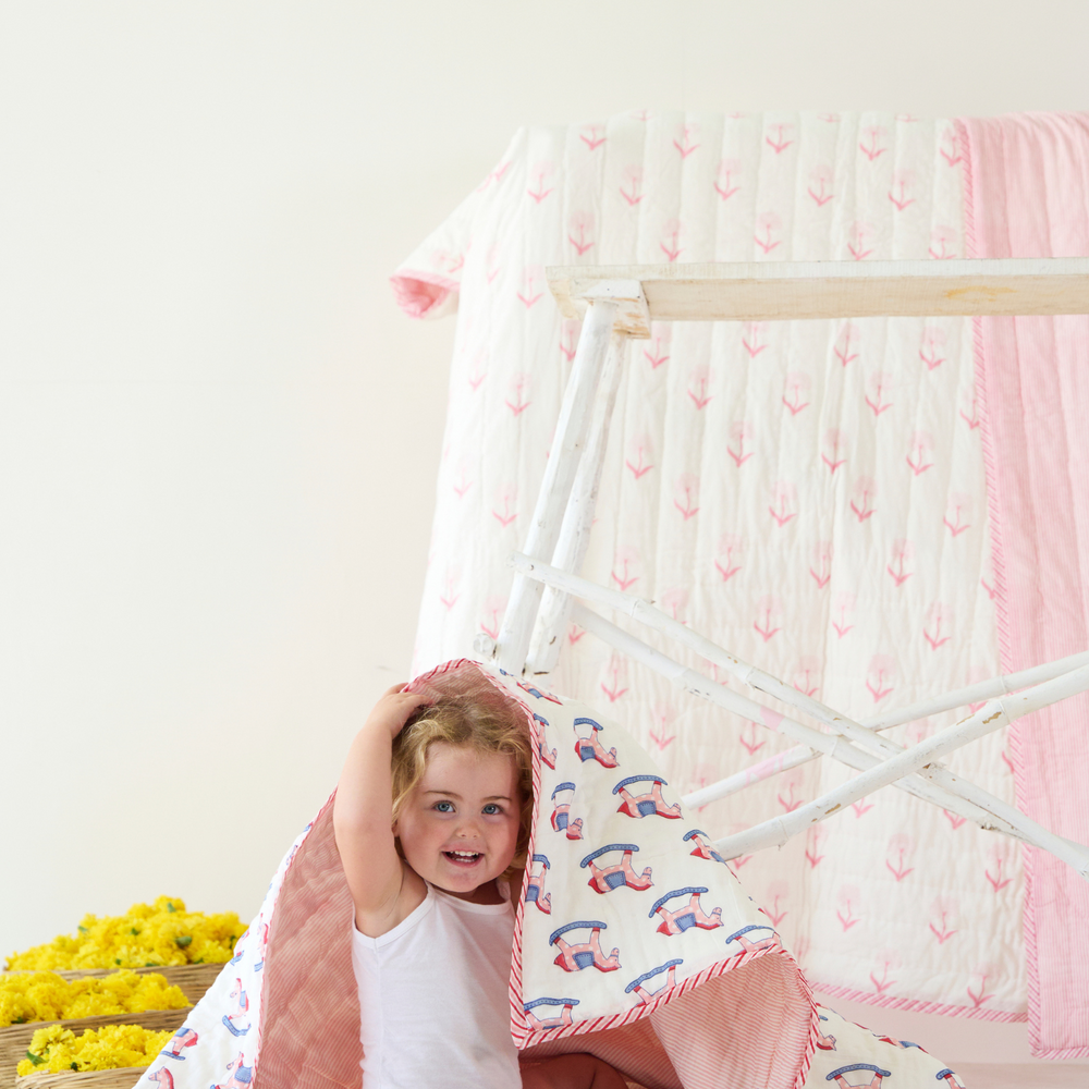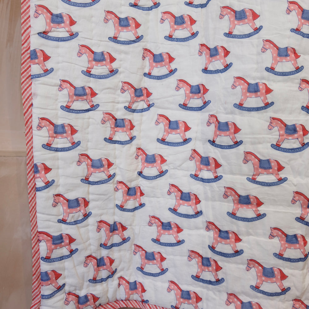 A large organic cotton cot / toddler quilt. The toddler quilt size can be used in a variety of ways including as a cot quilt, bed quilt, play mat and pram blanket. The are a super lovely addition to a bedroom or nursery.
