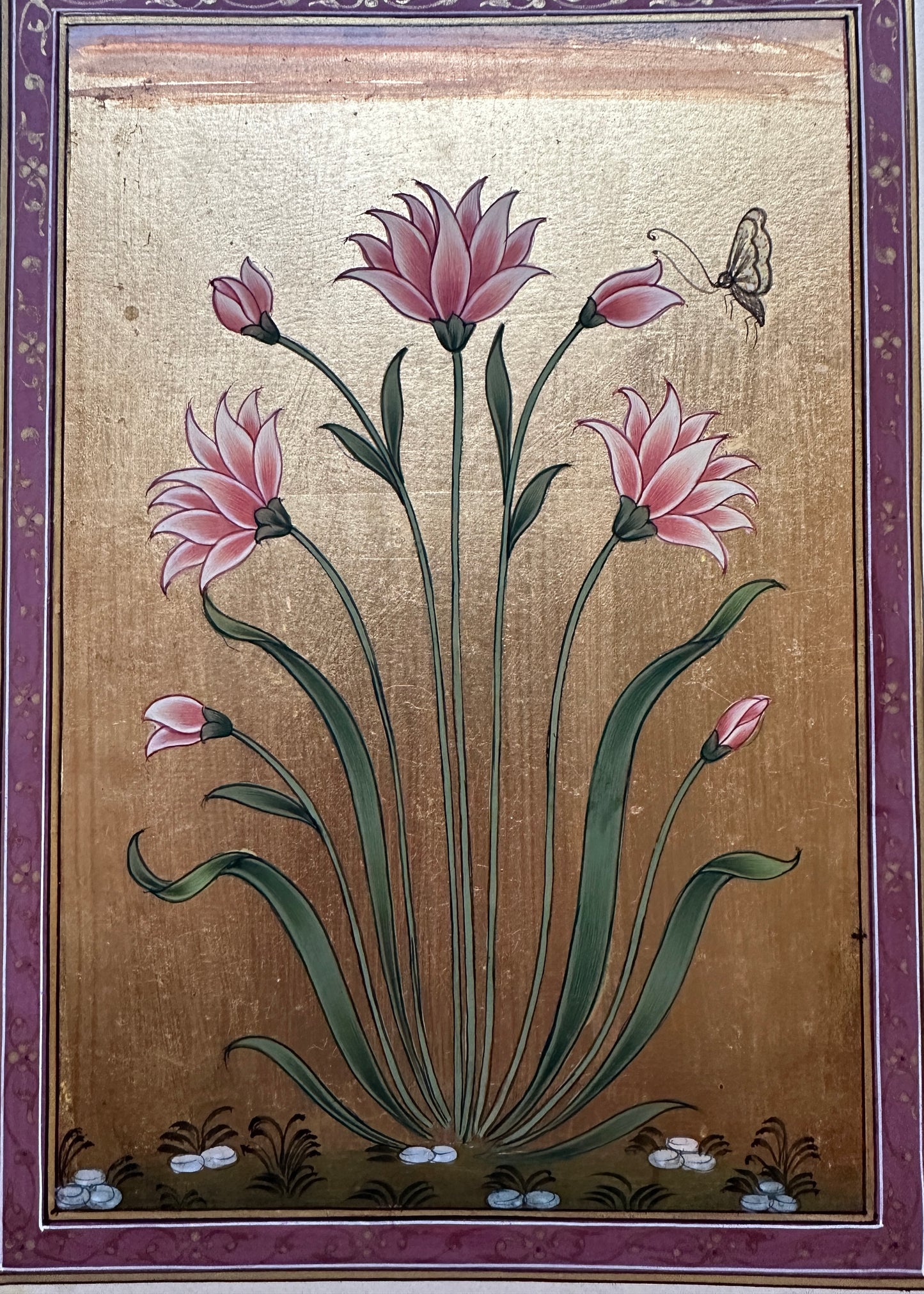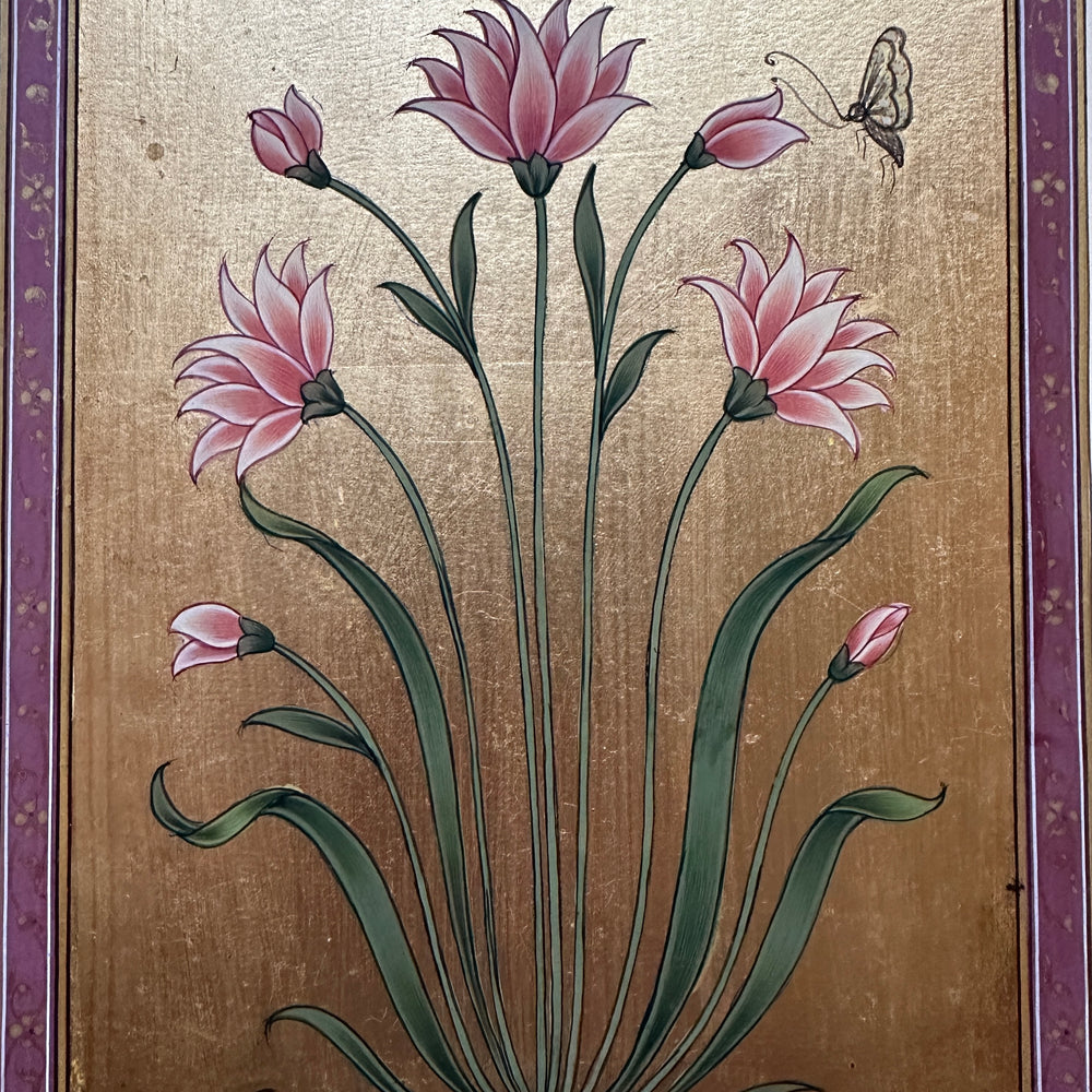 This piece is super special and from a collection of gold leaf paintings with a Mughal flower in the centre.