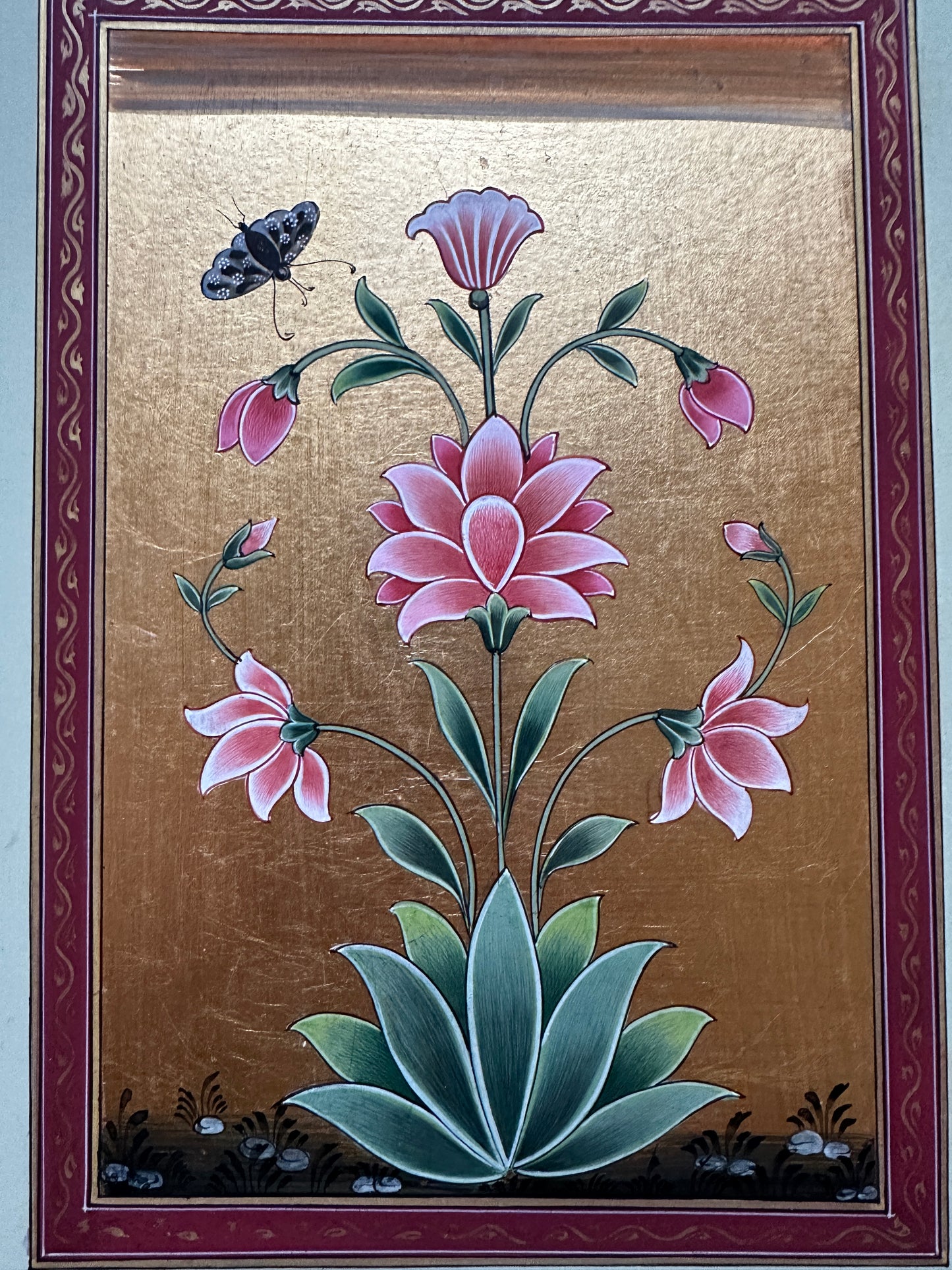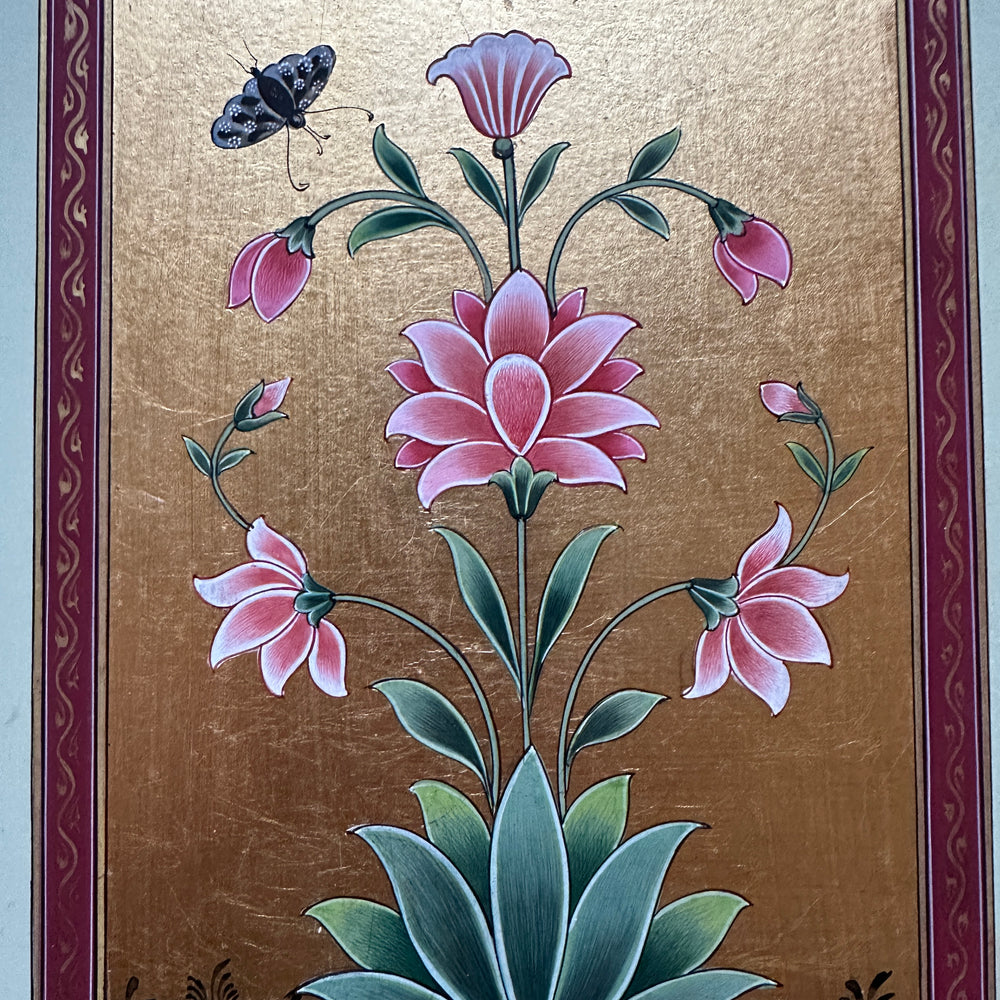 This piece is from a limited collection of gold leaf paintings with a Mughal flower in the centre.