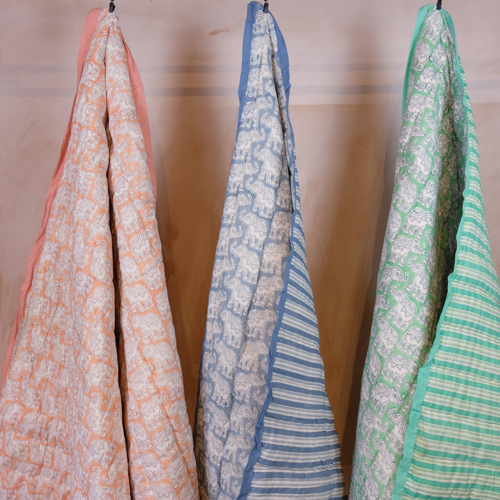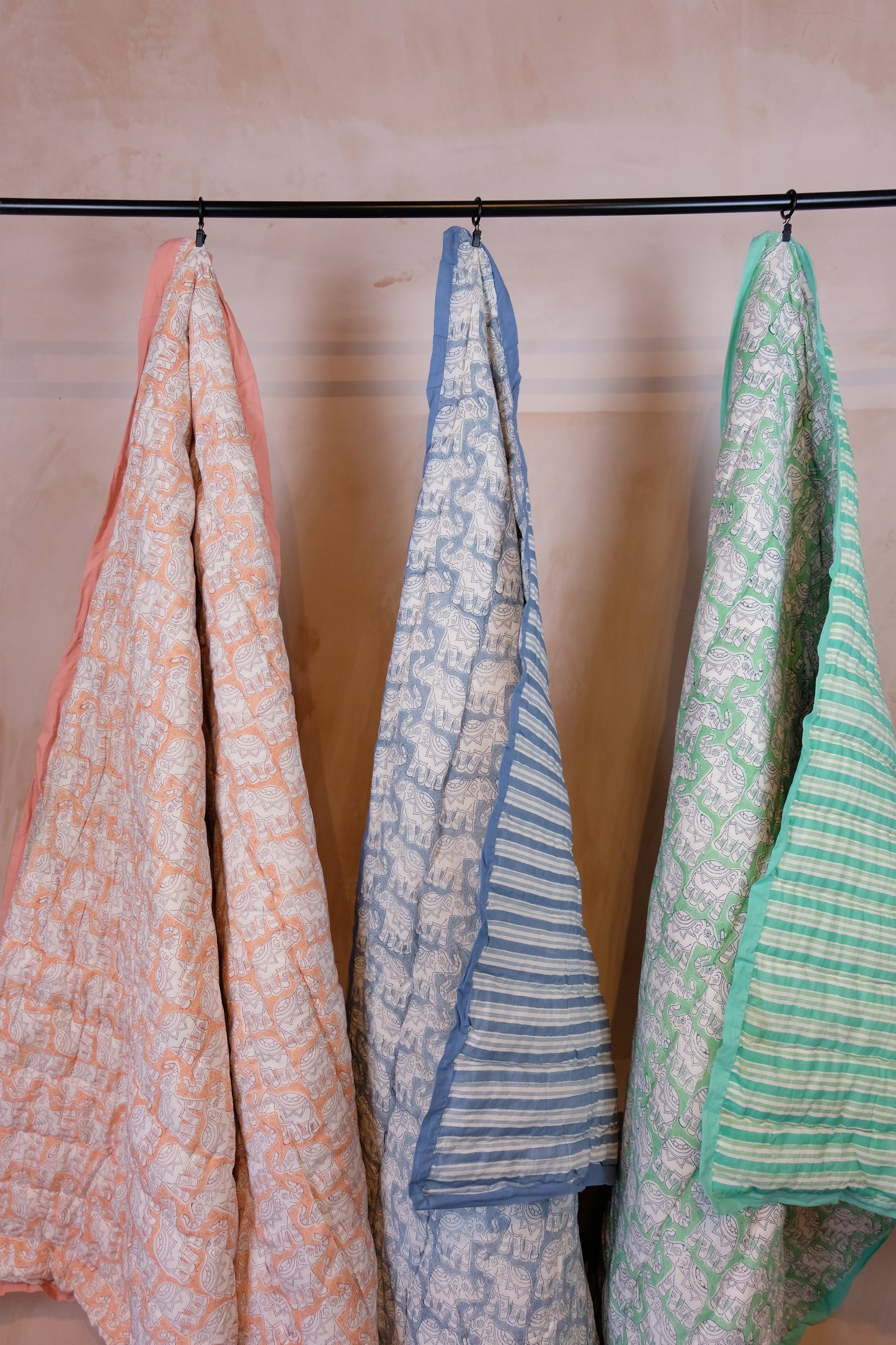 Introducing a playful new addition to our quilt collection: the elephant print quilt! Available in two sizes and three beautiful colour ways, each quilt features a charming thick stripe on the reverse side. Made from organic cotton with a cozy cotton quilt layer, these quilts are a perfect, stylish addition to any nursery or bedroom.