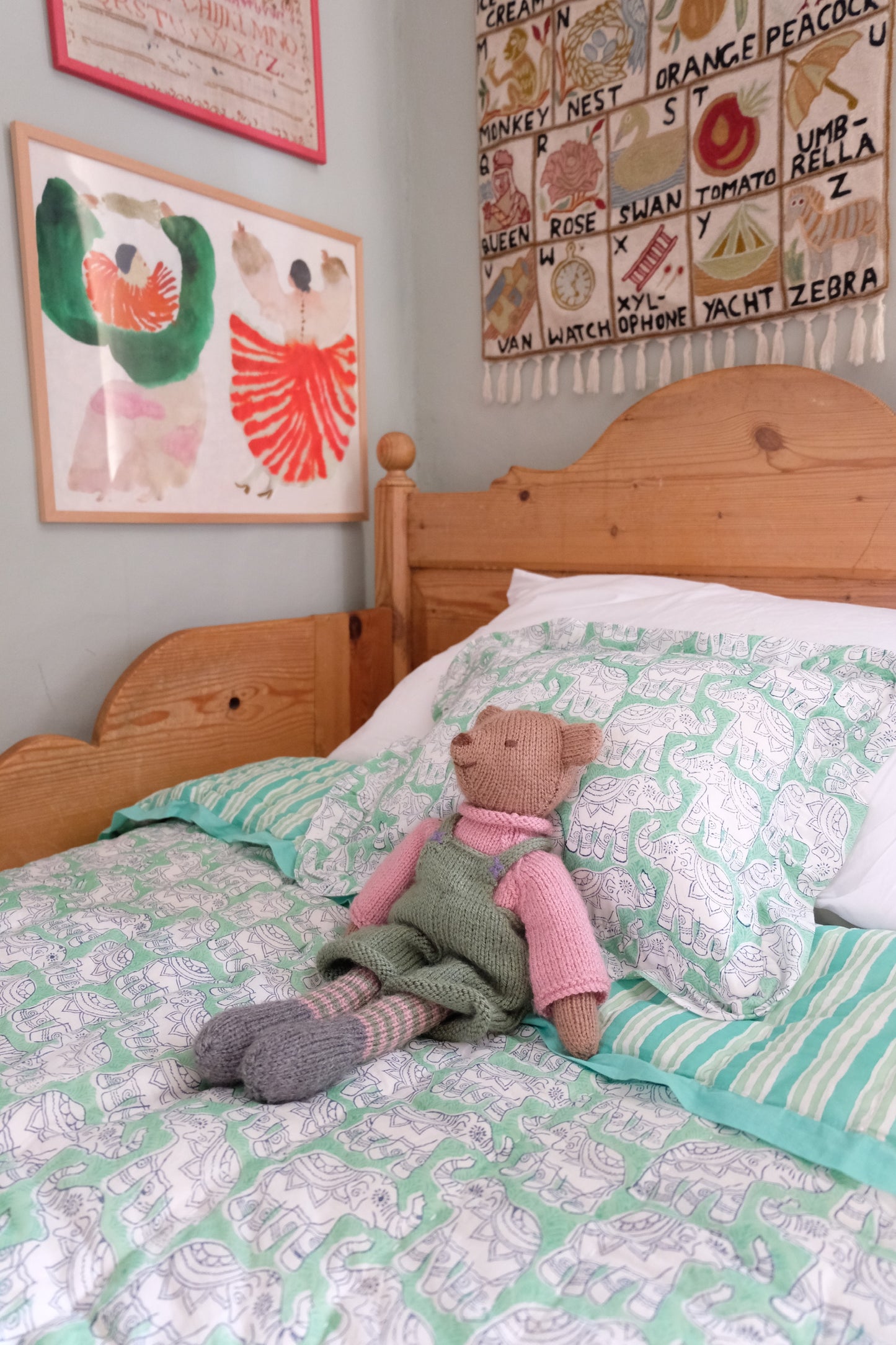 Organic Cotton Elephant Toddler Quilt – Green Block Printed Reversible Cot Quilt