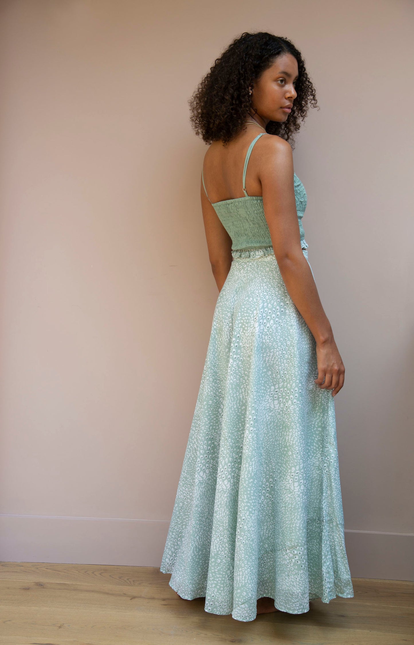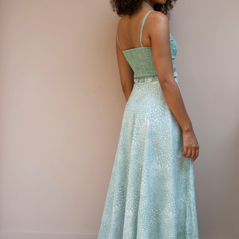 Our organic cotton Tallulah skirt is made using over 3 metres of fabric that has been hand printed by artisans in India. It is a great skirt that we team with our smocked top or a plain white tee.
