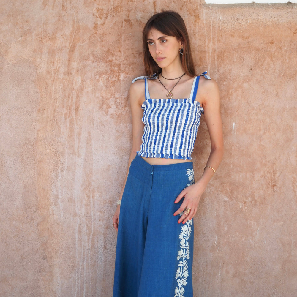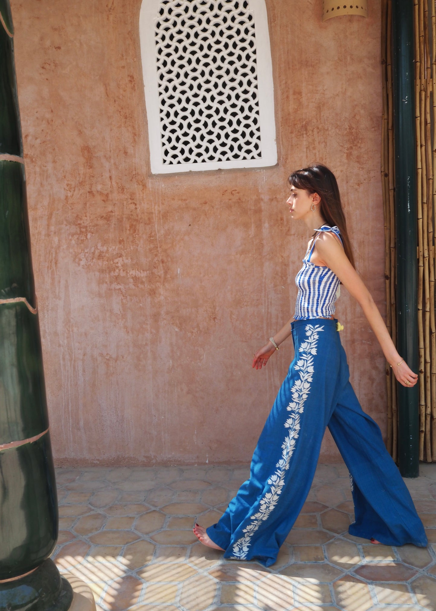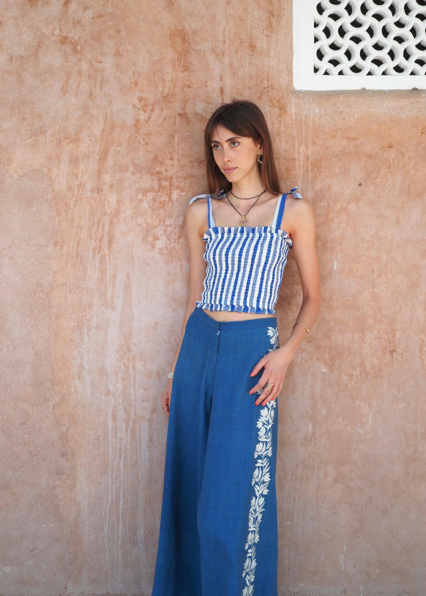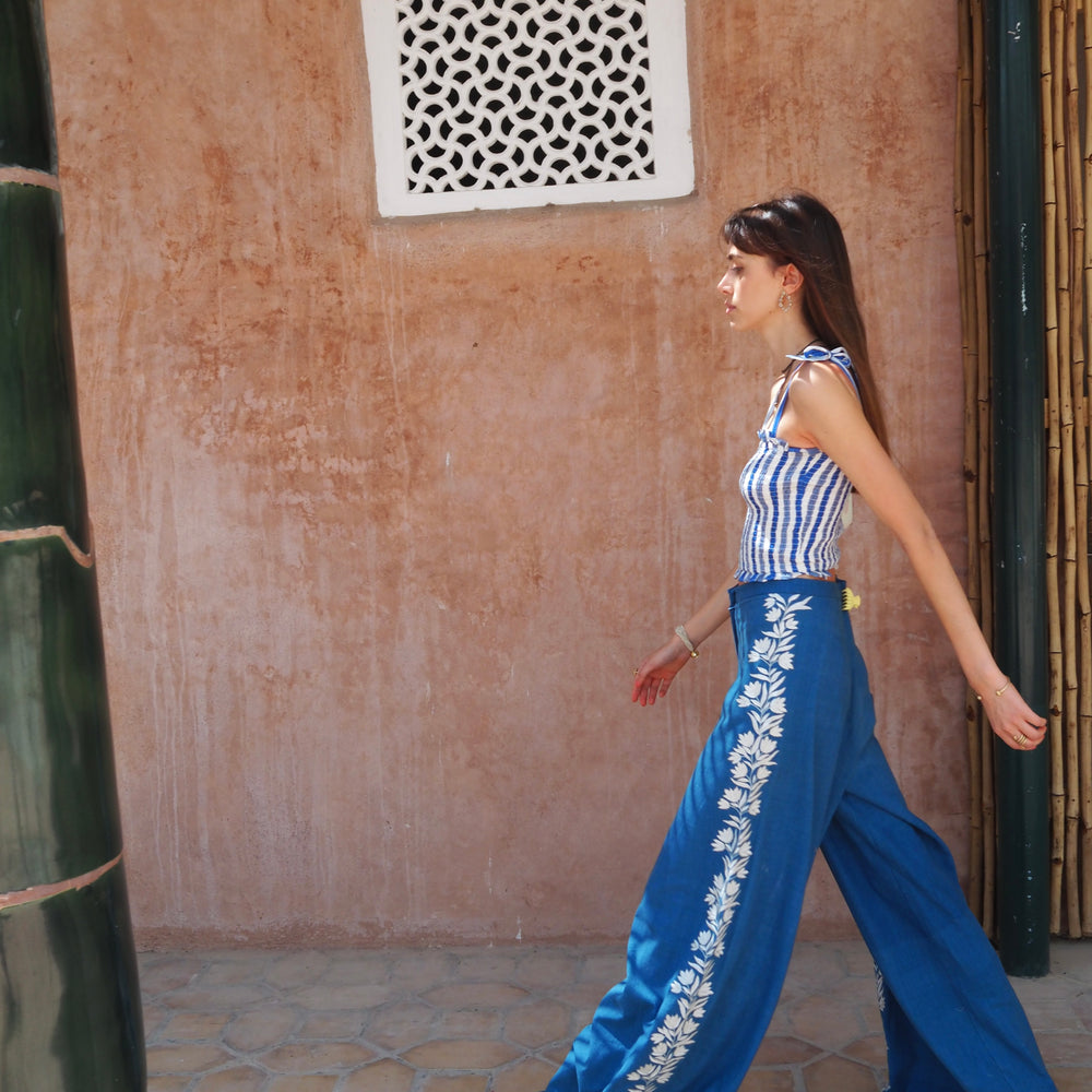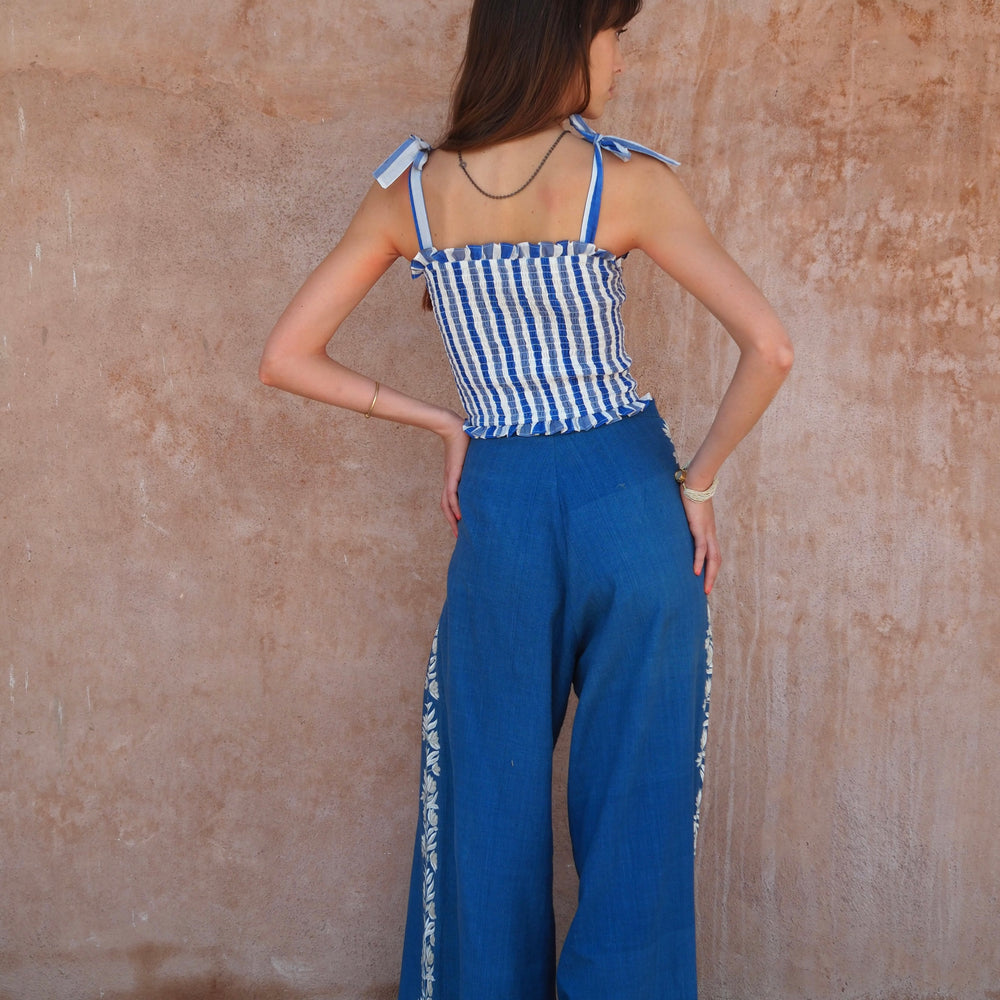 Introducing our Handloom Cotton High Waisted Trousers, where artisanal craftsmanship meets contemporary elegance. Crafted from luxurious handloom cotton, these trousers offer unparalleled comfort and breathability. Elevating the classic silhouette, delicate white floral embroidery cascades elegantly down the sides, infusing each step with a touch of refined charm. Perfect for any occasion, from casual outings to sophisticated evenings, these trousers effortlessly combine style and comfort, making them an essential addition to your wardrobe for timeless sophistication.