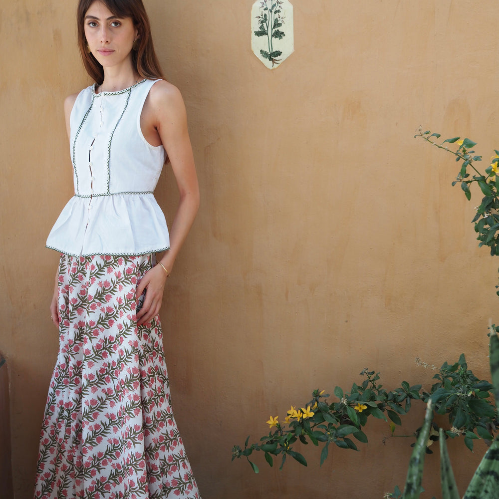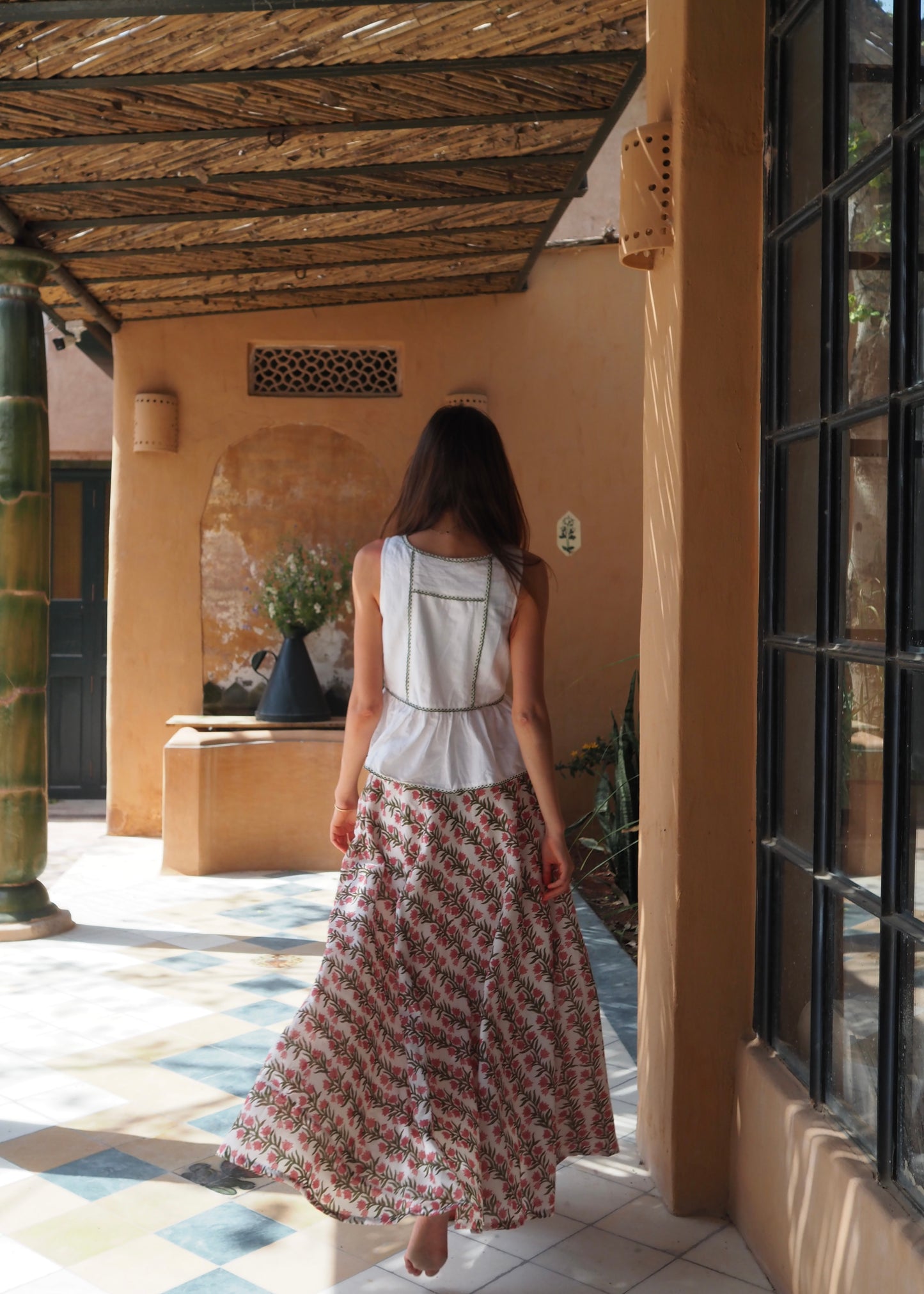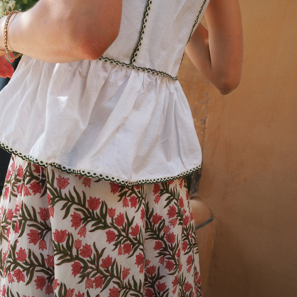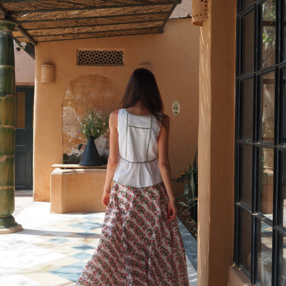 Our organic cotton Tallulah skirt is made using over 3 metres of fabric that has been hand block printed by artisans in India. It is a great Summer skirt that we team with our new handloom shirt, smocked top or a plain white tee.