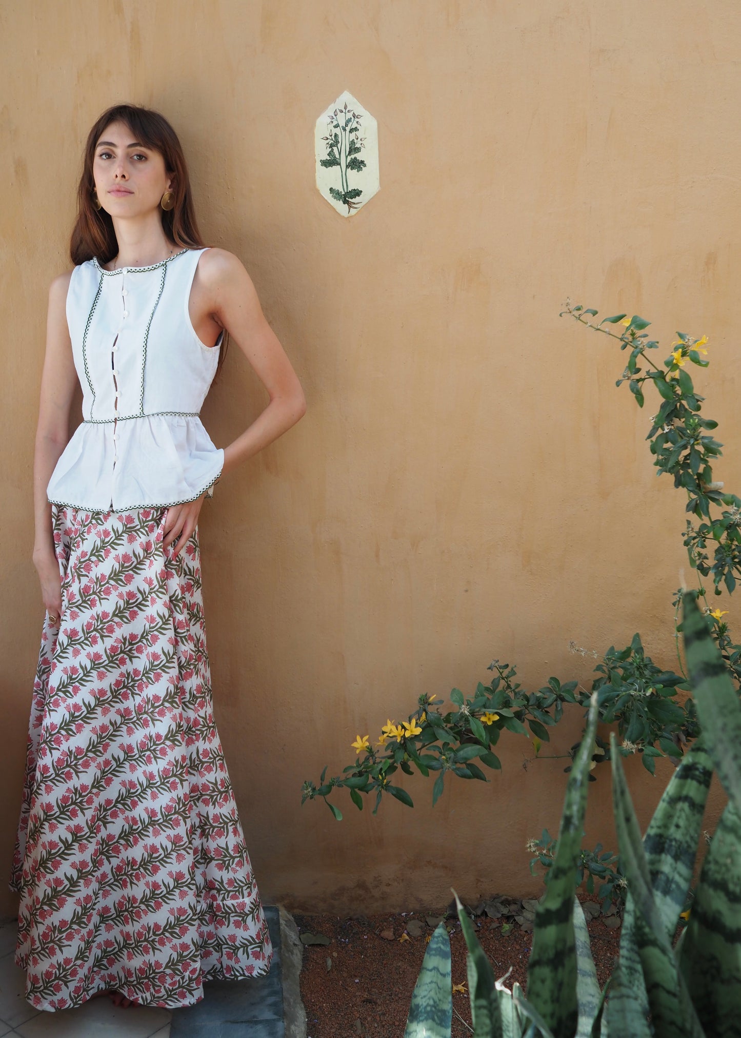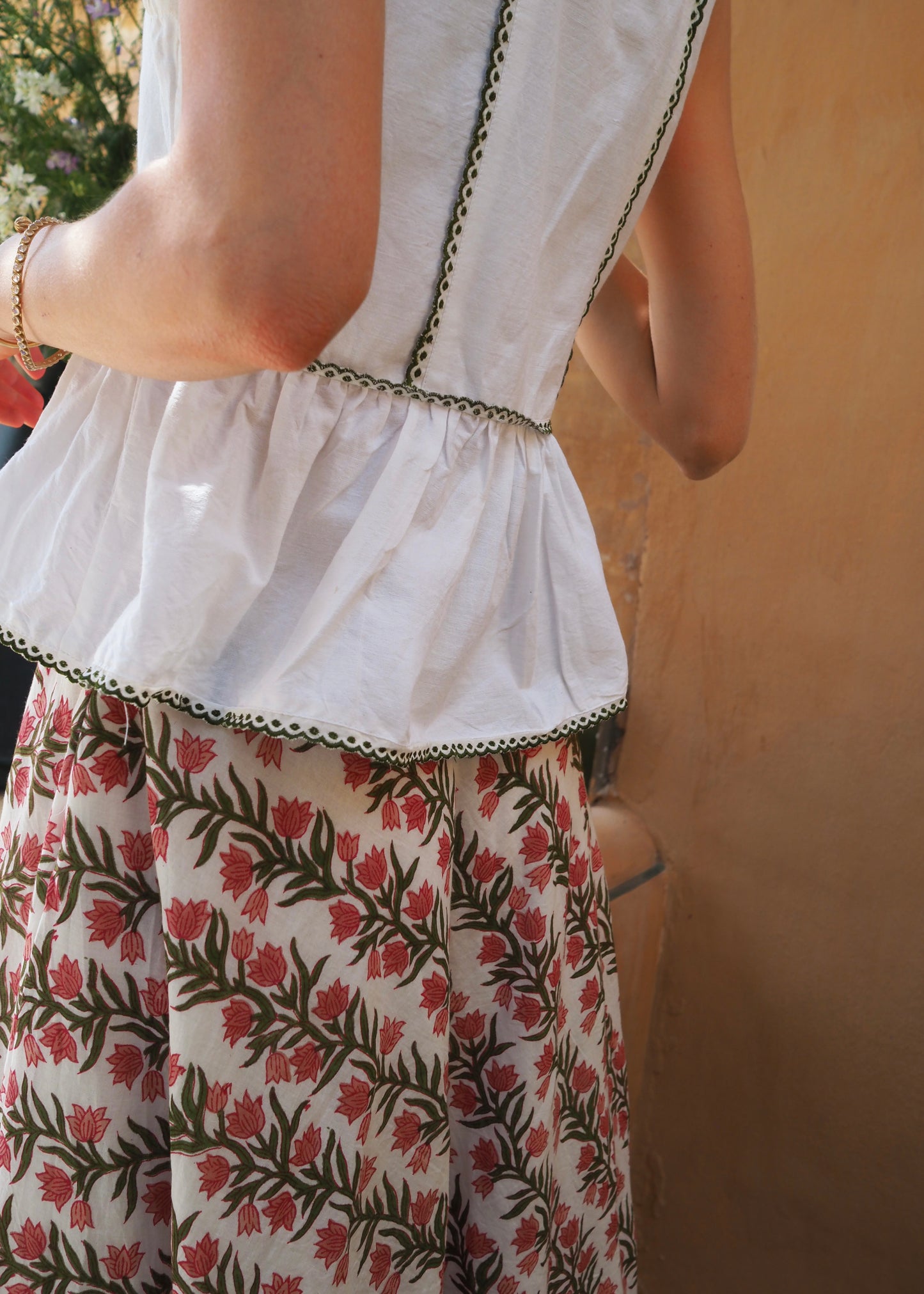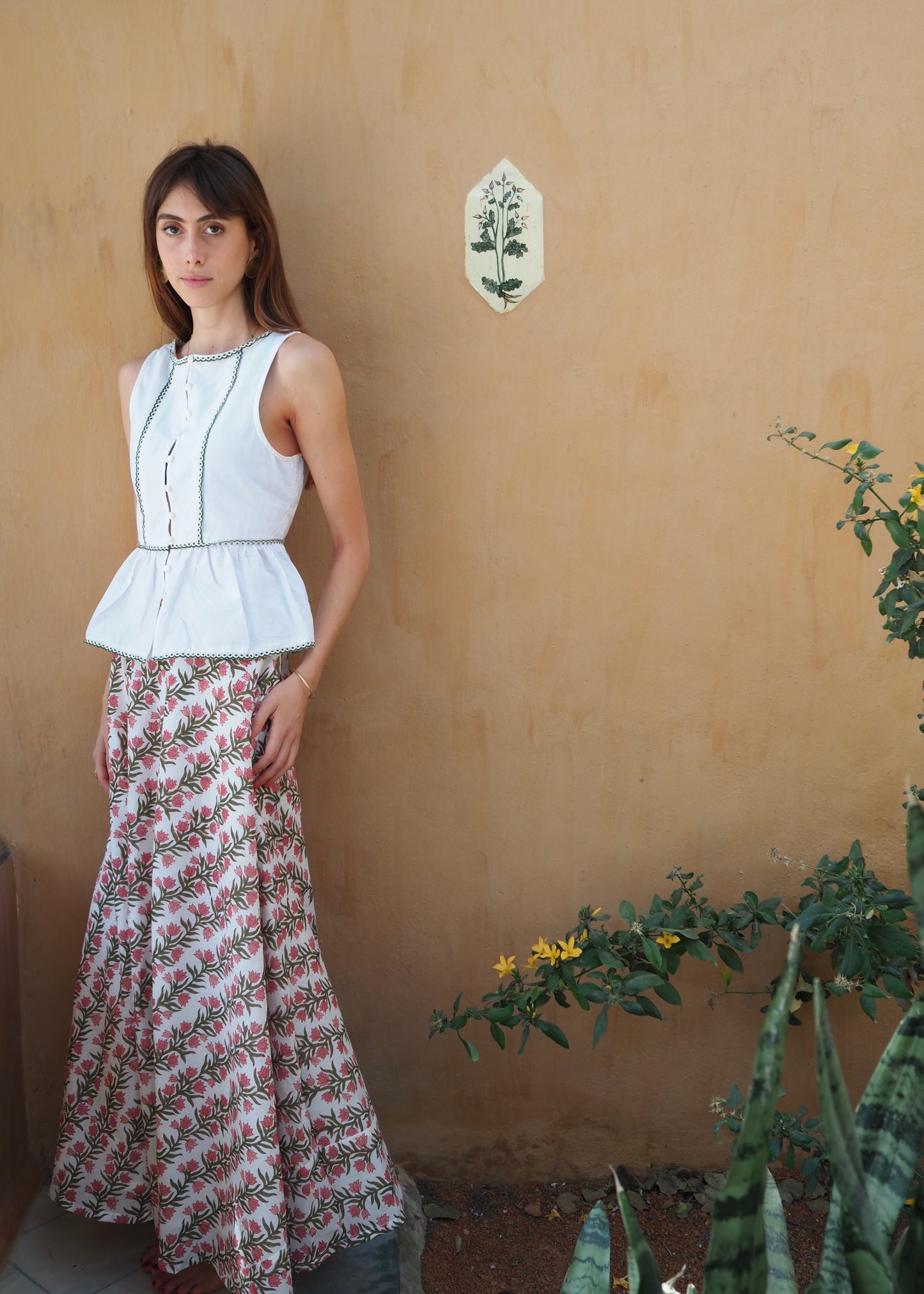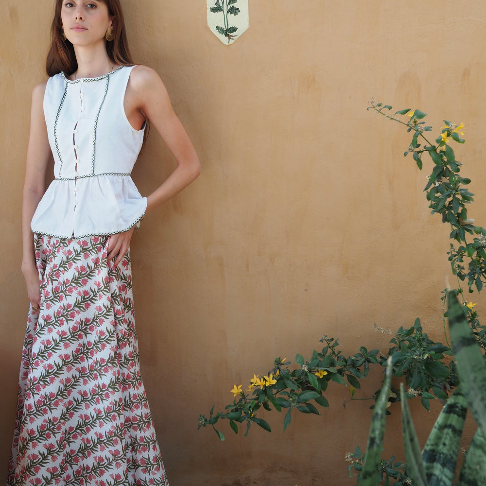 Our organic cotton Tallulah skirt is made using over 3 metres of fabric that has been hand block printed by artisans in India. It is a great Summer skirt that we team with our new handloom shirt, smocked top or a plain white tee.