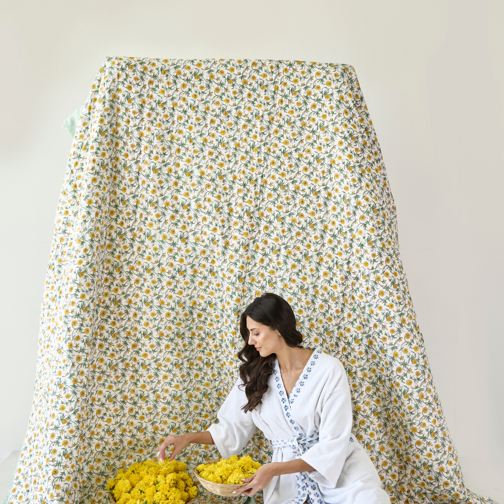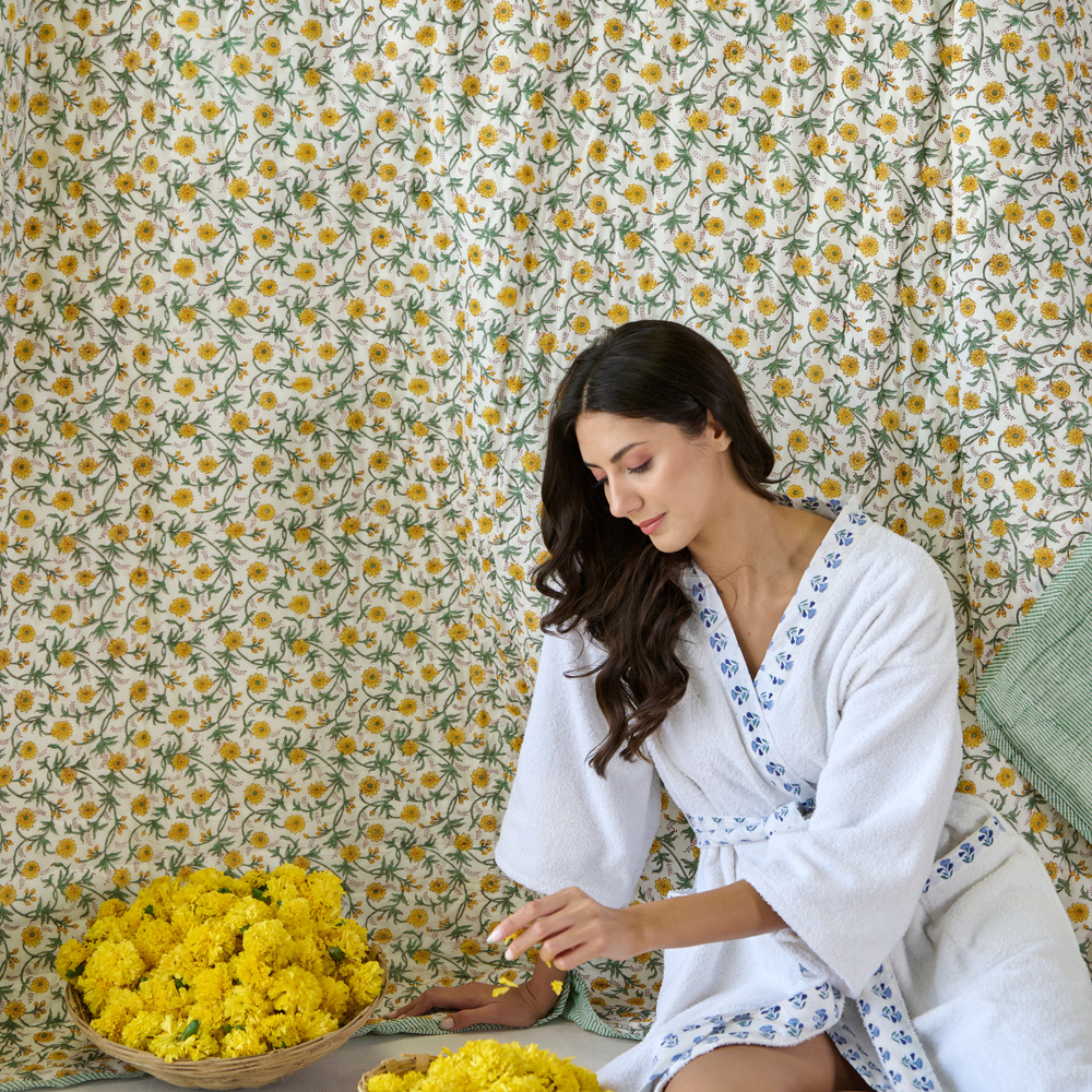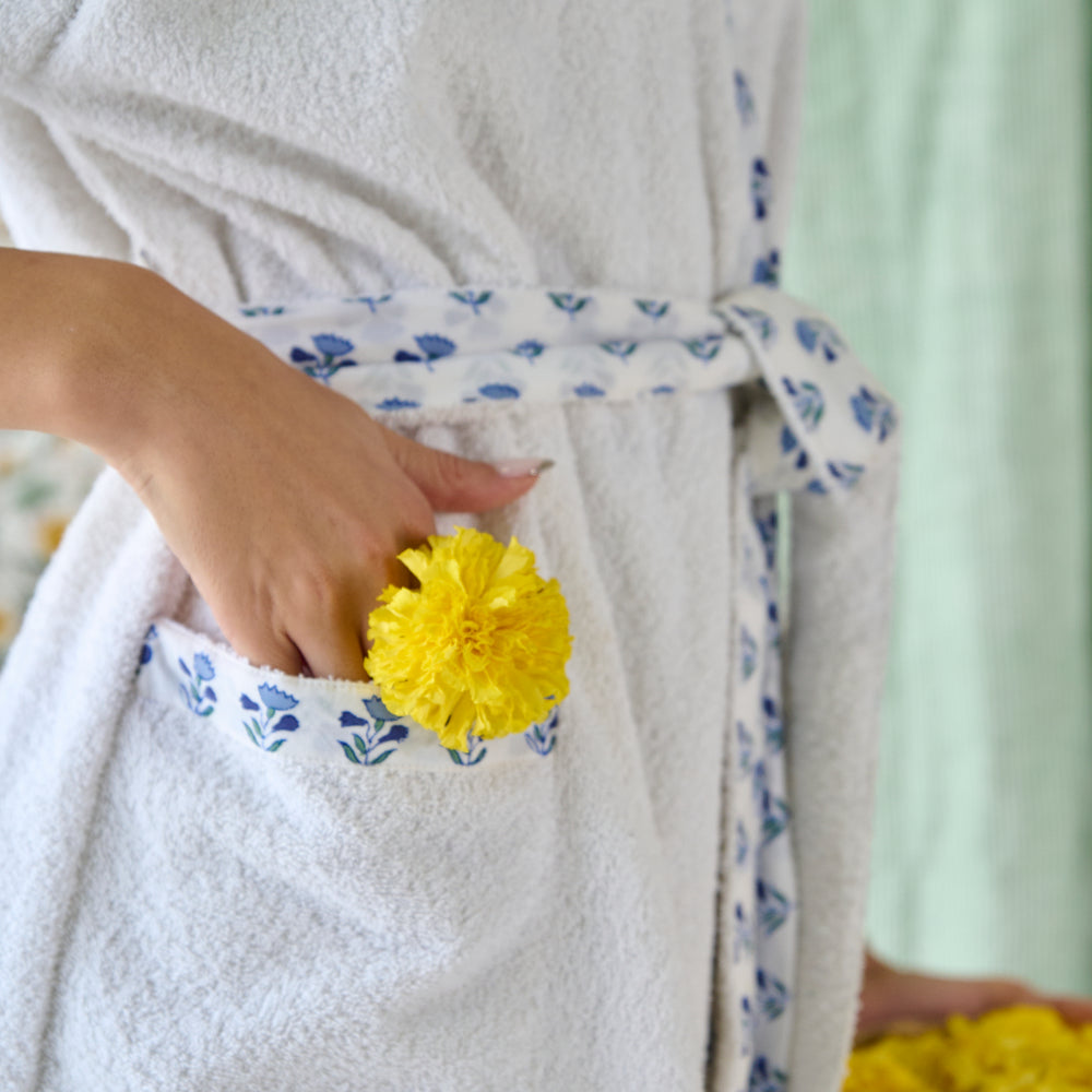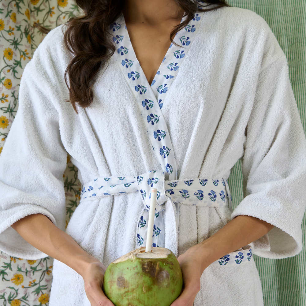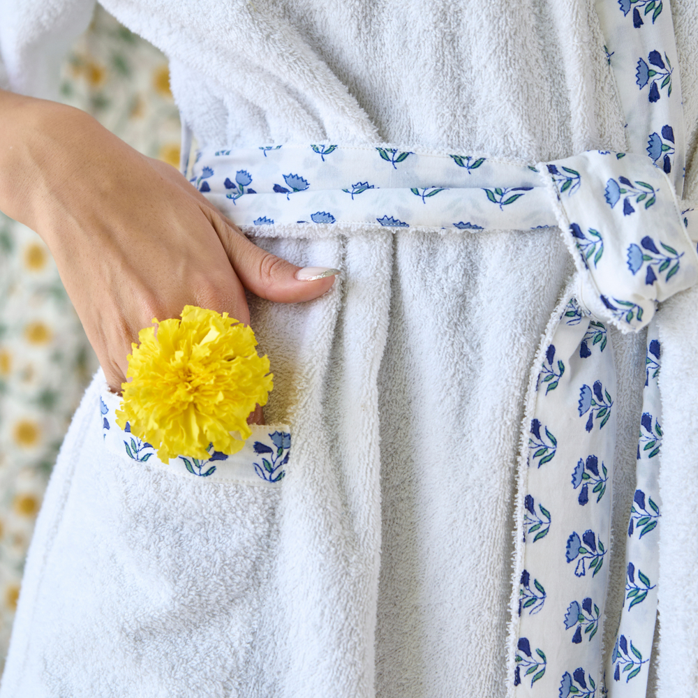 Our new towel dressing gown is our favourite gown yet! Jump straight out of the bath and wrap your self in this lovely organic cotton towel gown. We have added a block print trim around the waist, collar and pocket to add a little something different.