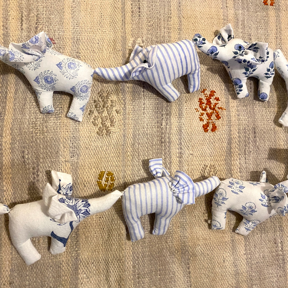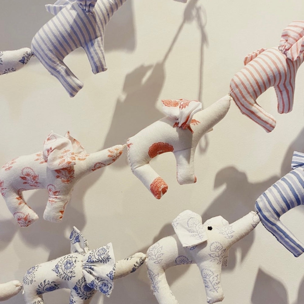 Super sweet and decorative, our elephant bunting is made from the waste fabric used on the other baby items helping with our mission to create zero waste. The bunting is sold either with five elephants or ten elephants. The five elephant strings are perfect for the end of a cot or as a pram mobile and the ten elephant strings look great above a bed, hanging between pictures in a nursery, or decorating a toddler’s nursery tent - this bunting will actually look very sweet anywhere! A different, very sweet and environmentally friendly gift for little ones.