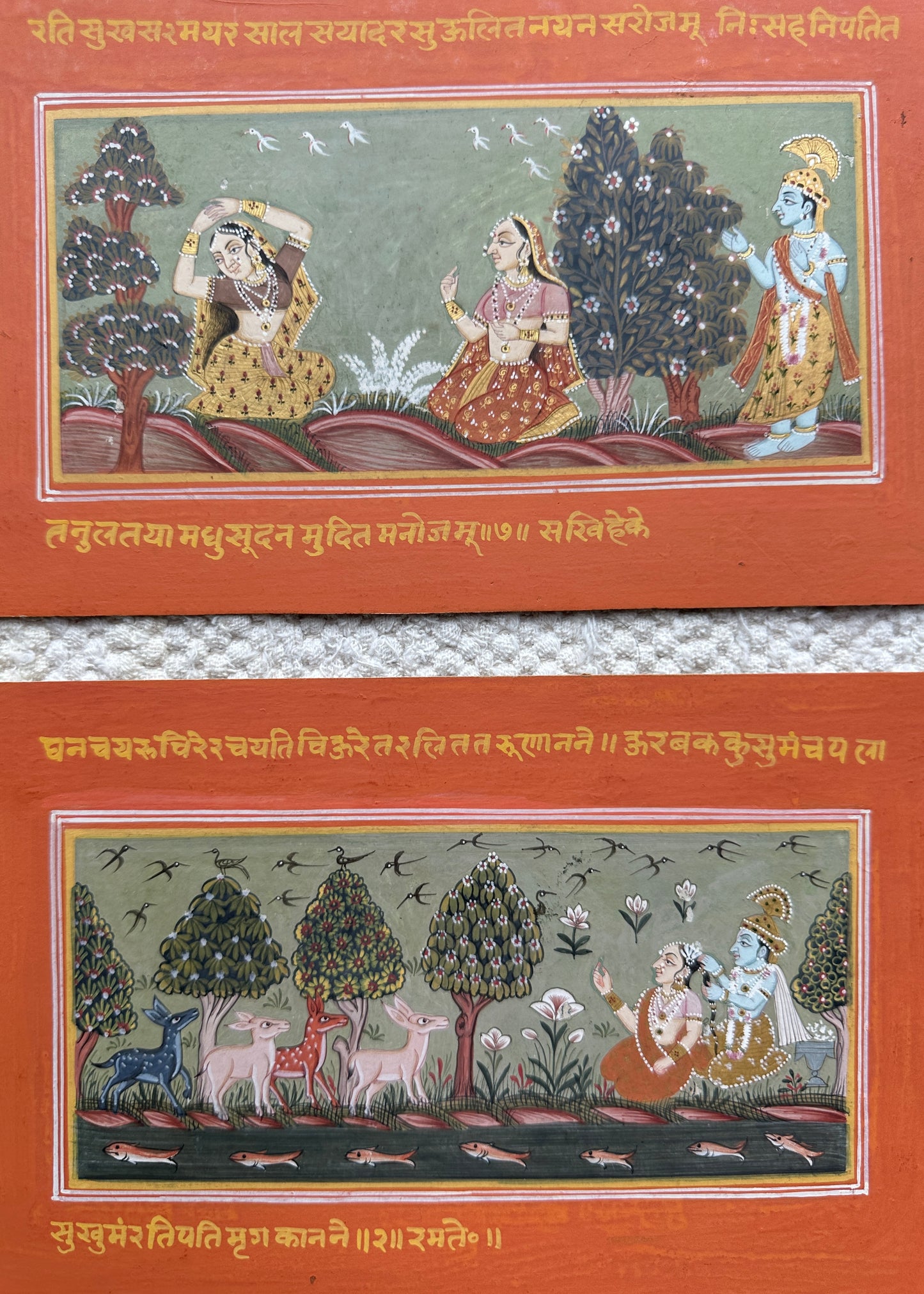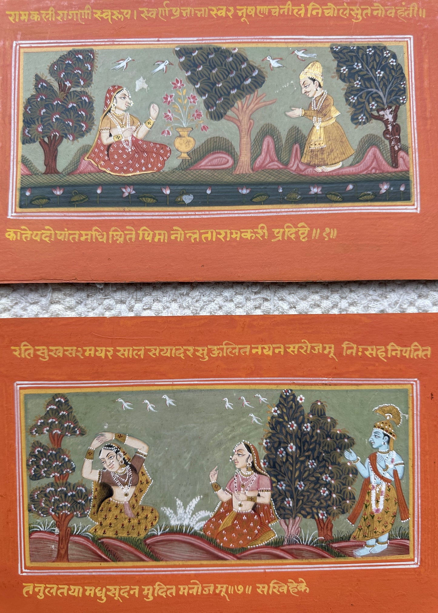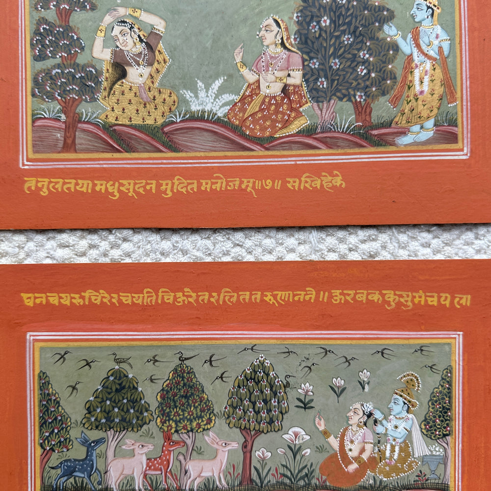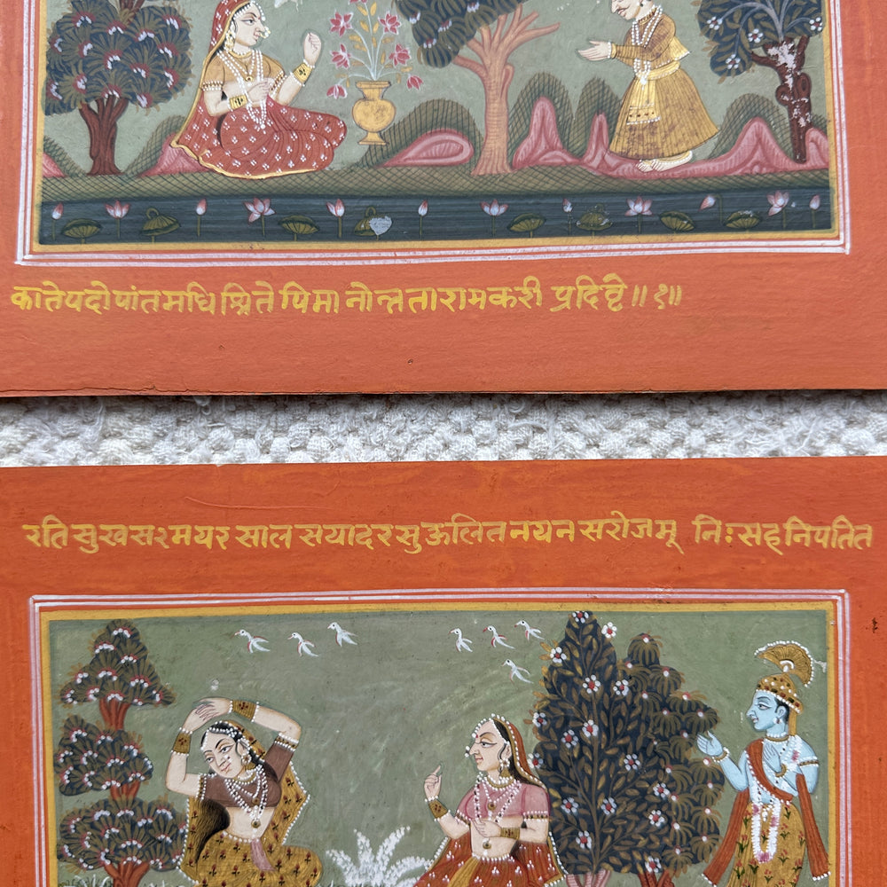A set of three paintings depicting Krishna and Radha with friends in a garden, beautifully executed in the Basohli School of Art.