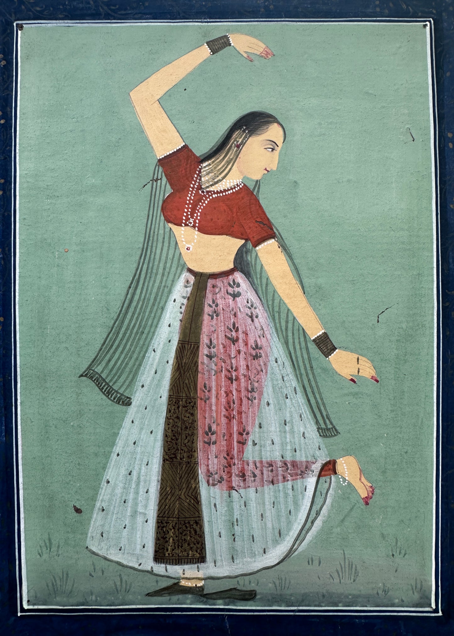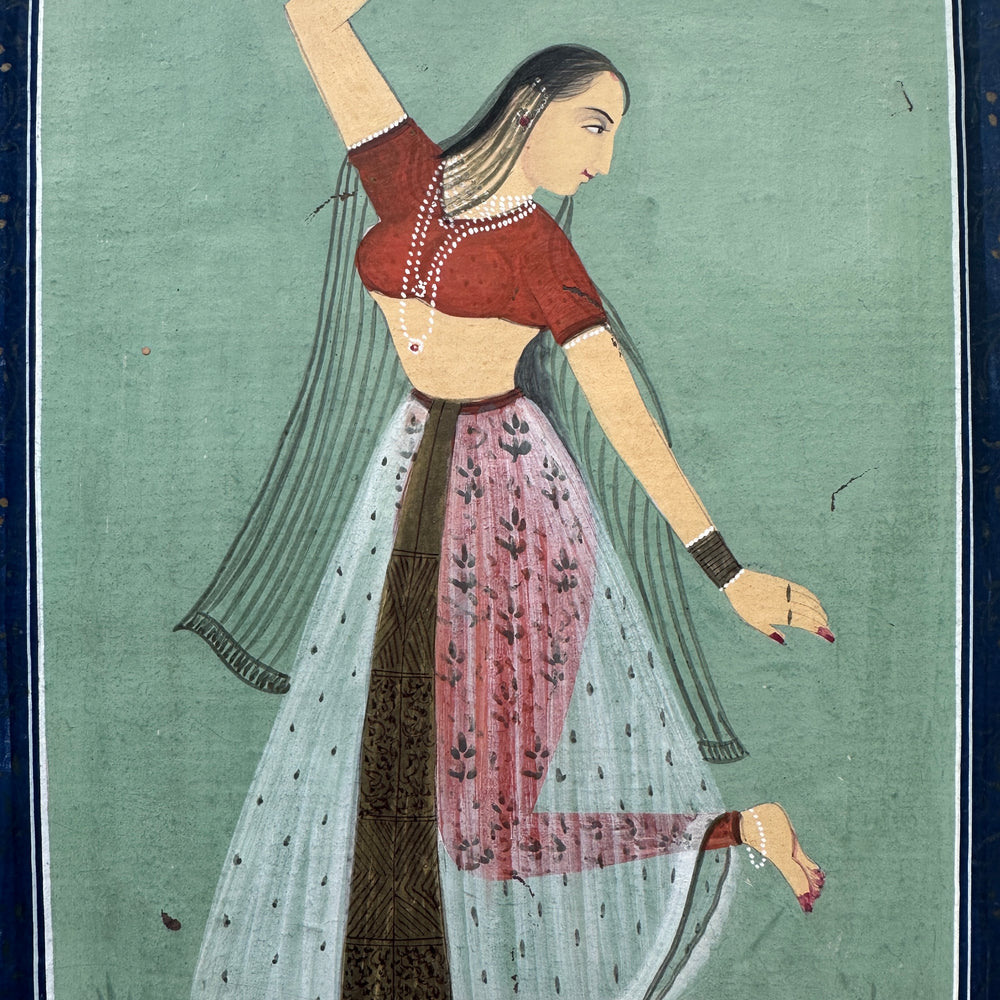 This charming artwork depicts a dancing lady in a garden, painted around 50 years ago in the Jaipur School of Art style, using natural stone colours on parchment paper.