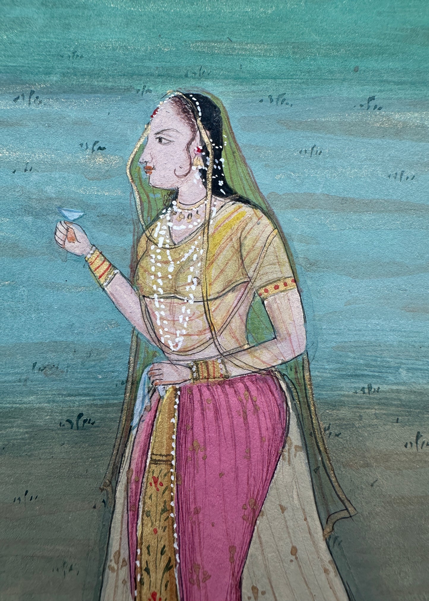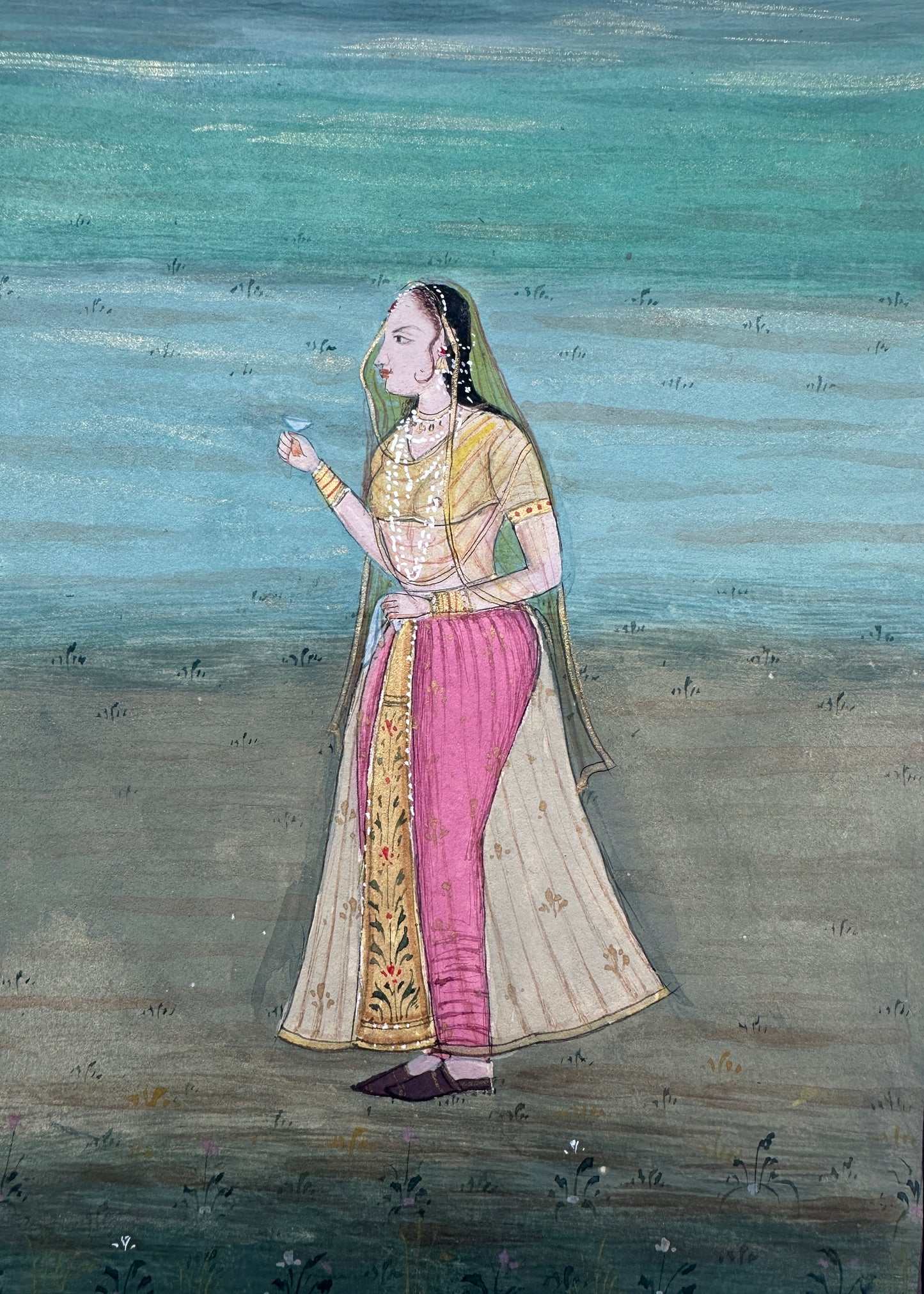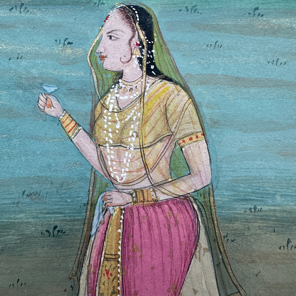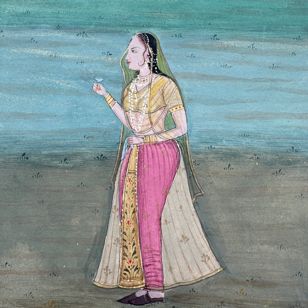 A beautiful painting of a Mughal Maharani standing gracefully in a garden, rendered in the traditional Jaipur School of Art style.