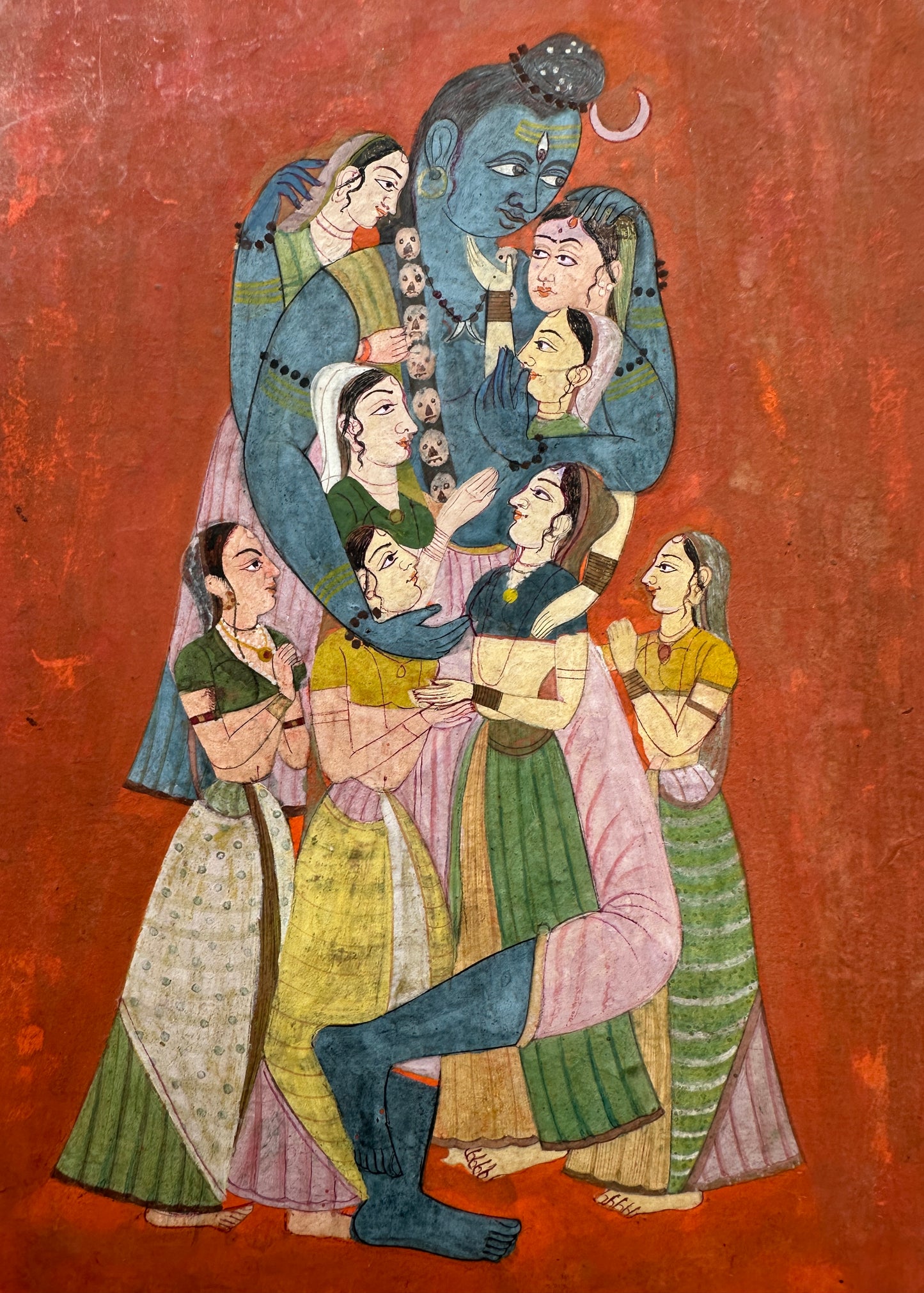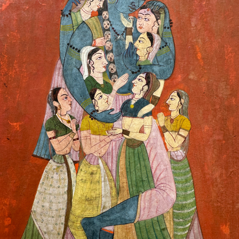 This exceptional and rare painting depicts Lord Shiva with Parvati and her companions, rendered in the distinctive Basohli School of Art style. Approximately 60 years old, it is a beautiful example of traditional Indian miniature painting.