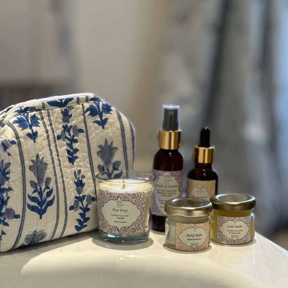 Each item is made with love and care using only natural ingredients – safe for mum and baby alike. The reusable, block printed pouch adds a touch of artisan charm, making this a truly special gift for any expectant mother.