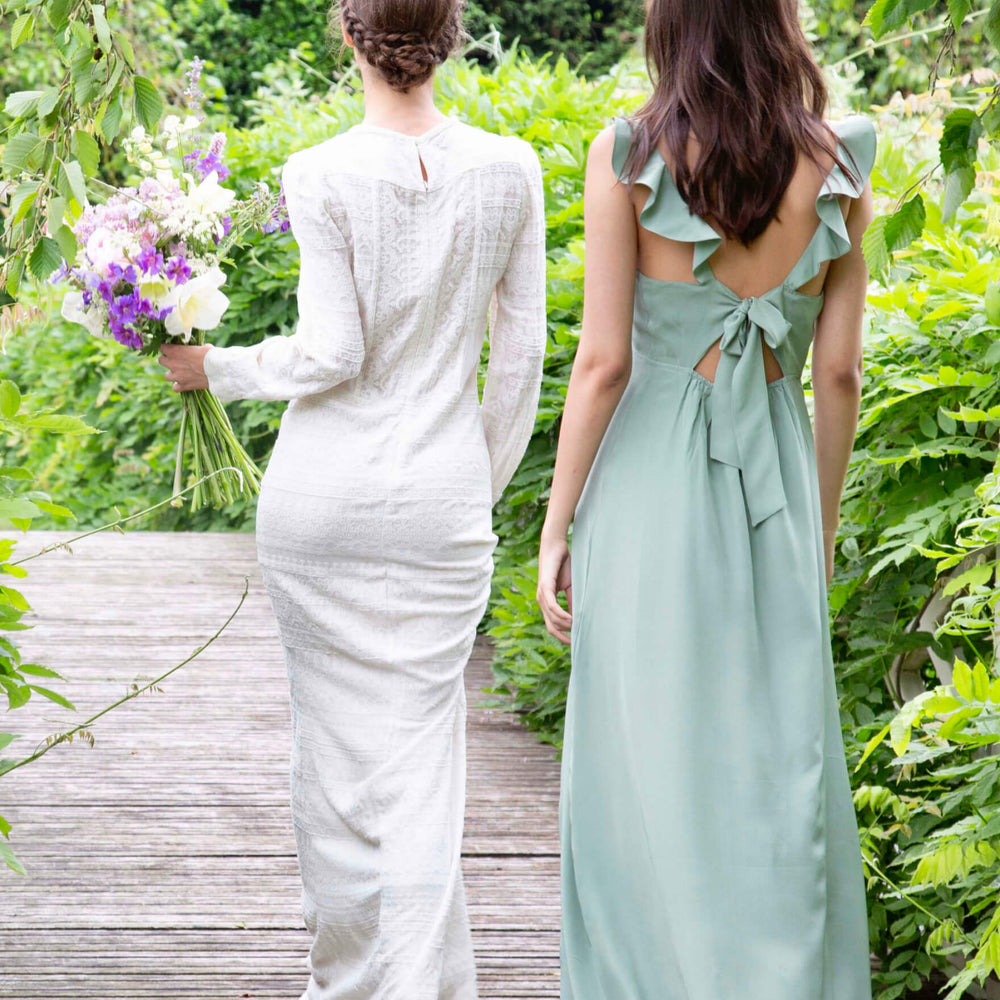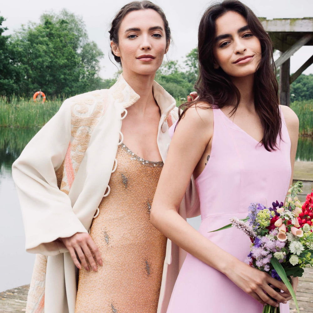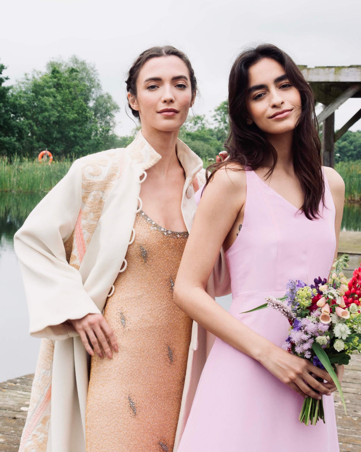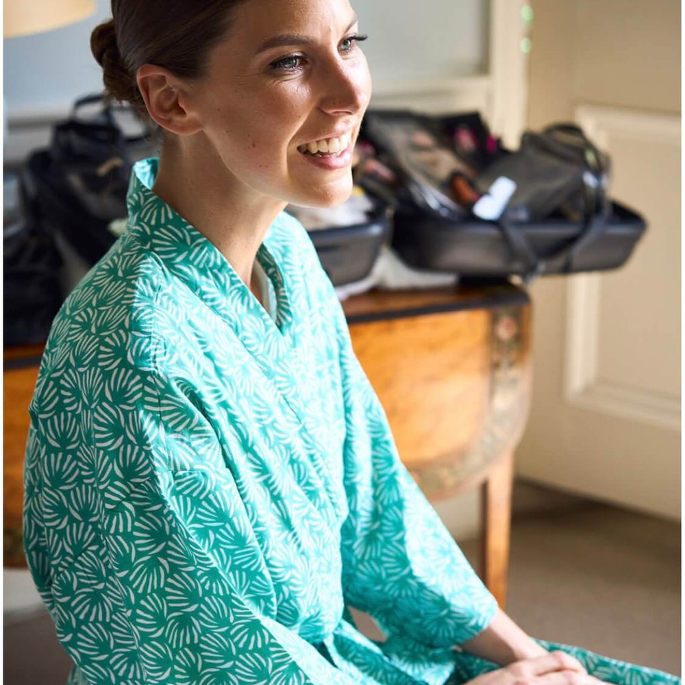 Smiling bridal party wearing light patterned bespoke dressing gowns and drinking Champagne