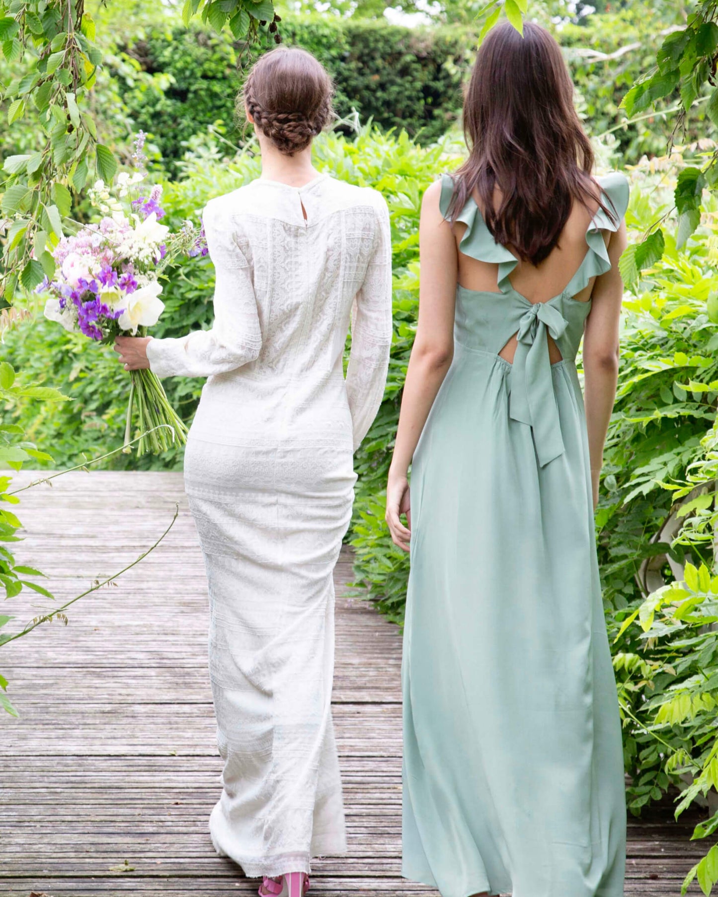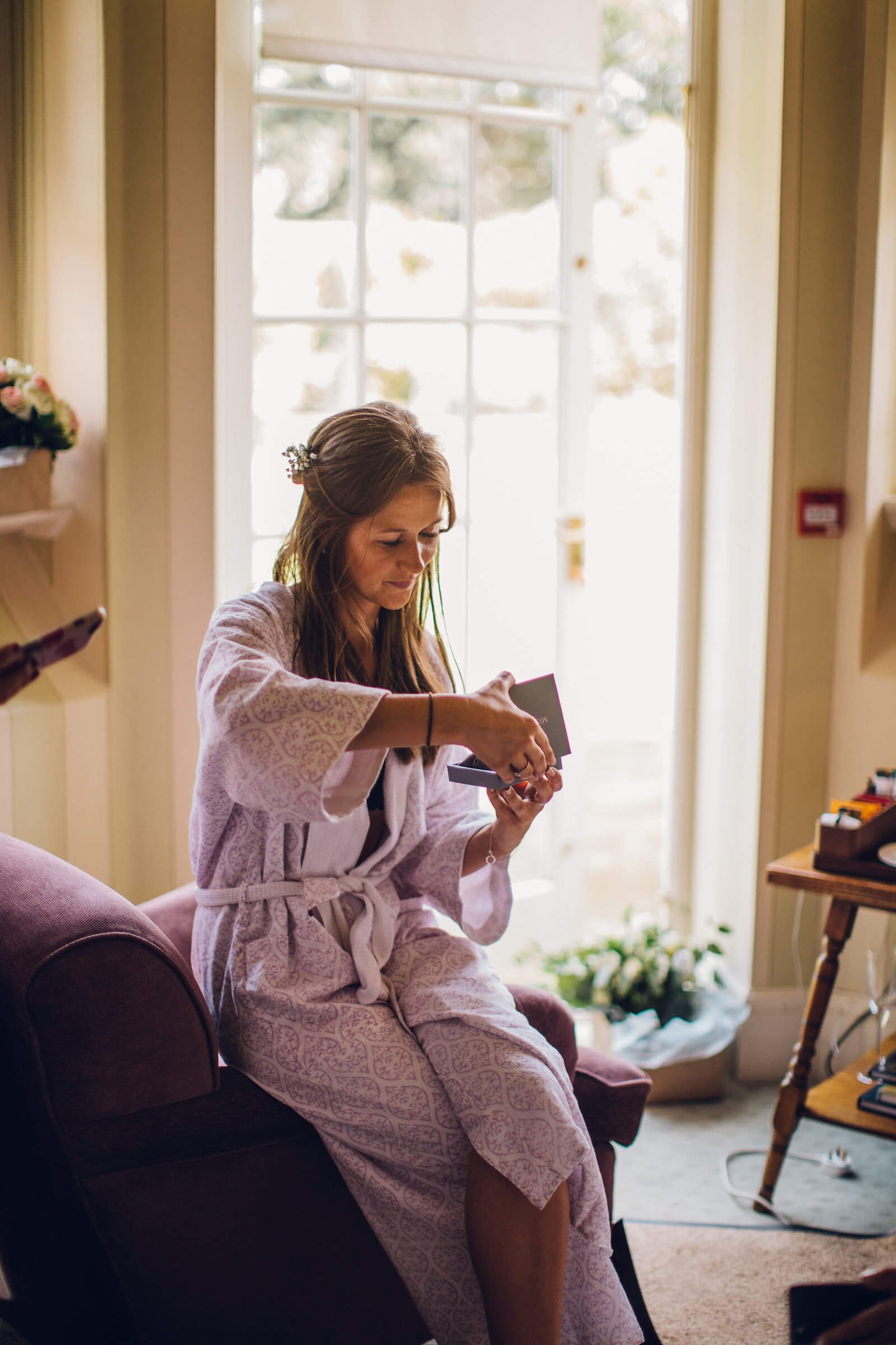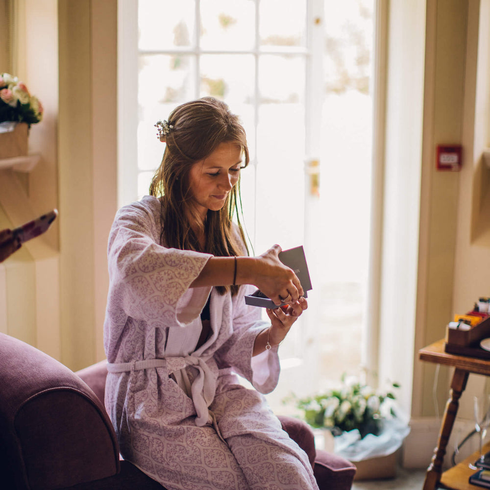 Bride wearing light purple bespoke dressing gown opening a jewellery box
