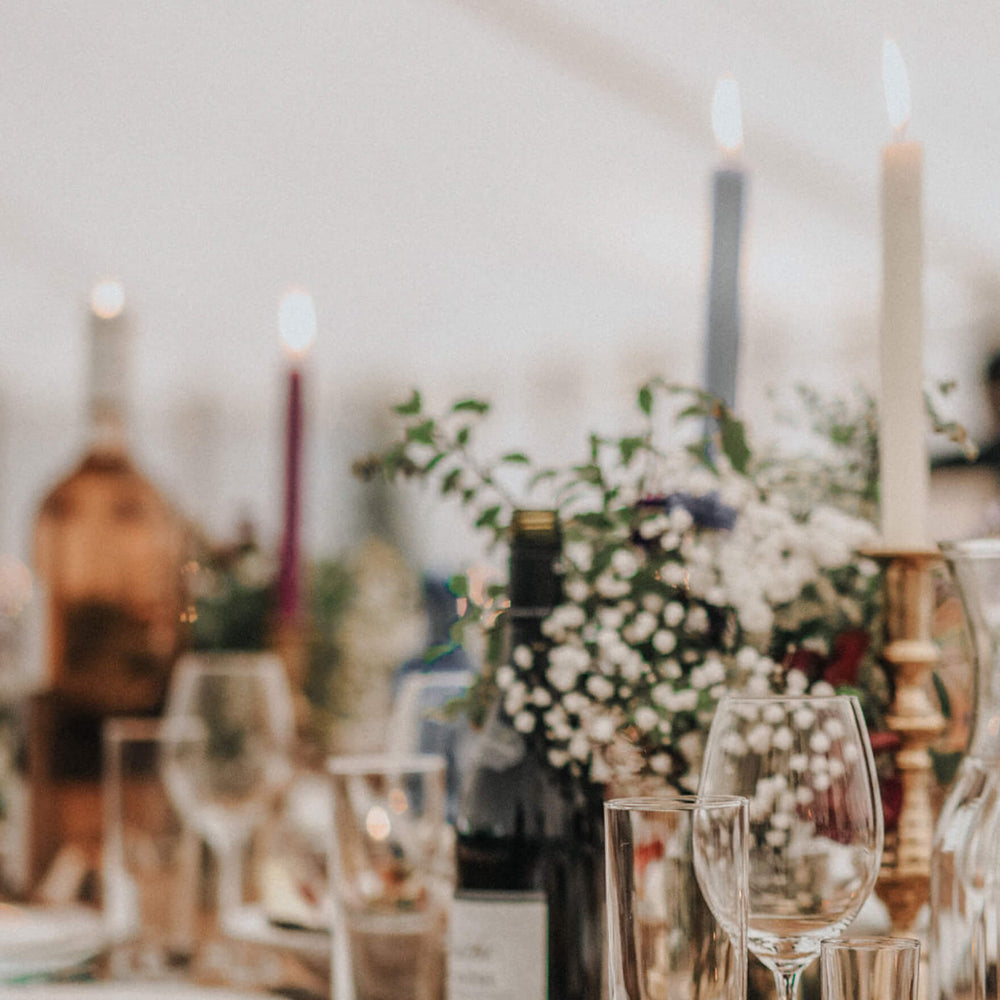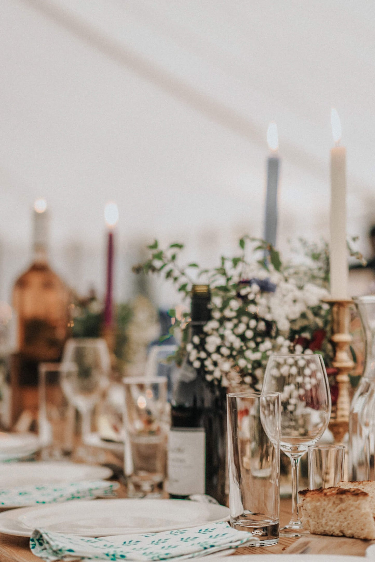 Wedding table with bespoke printed napkins, glassware, candles and fresh white flowers
