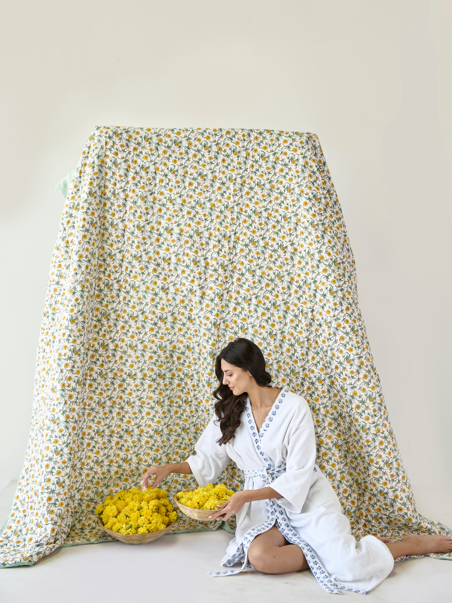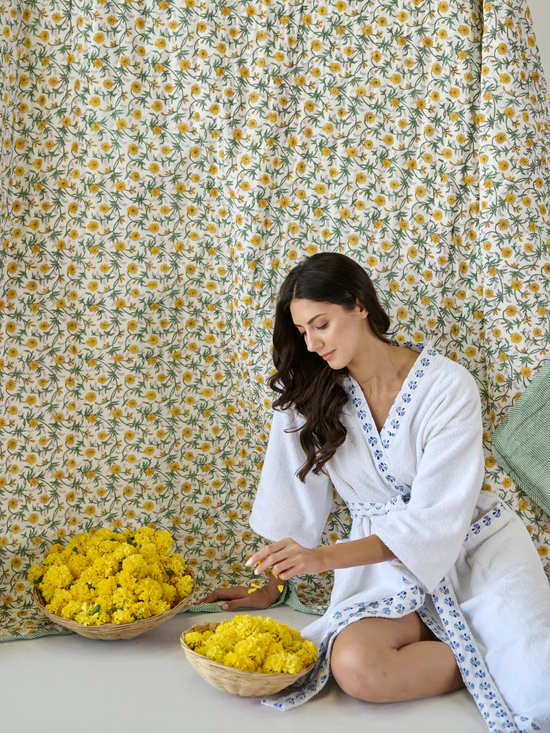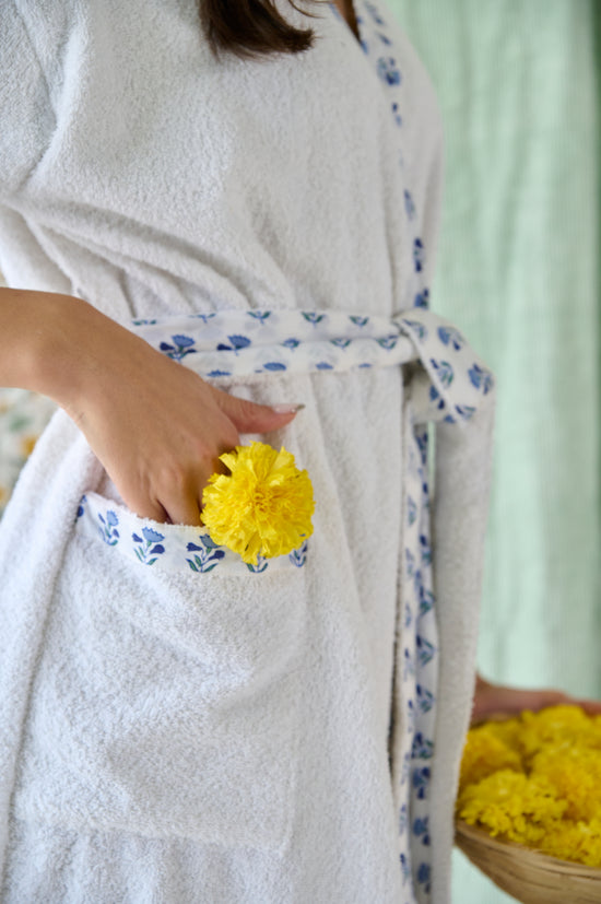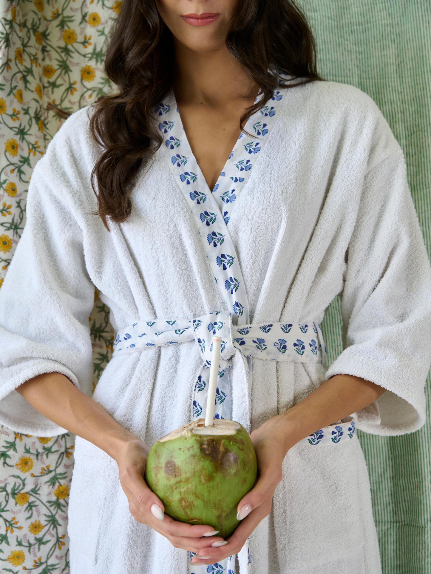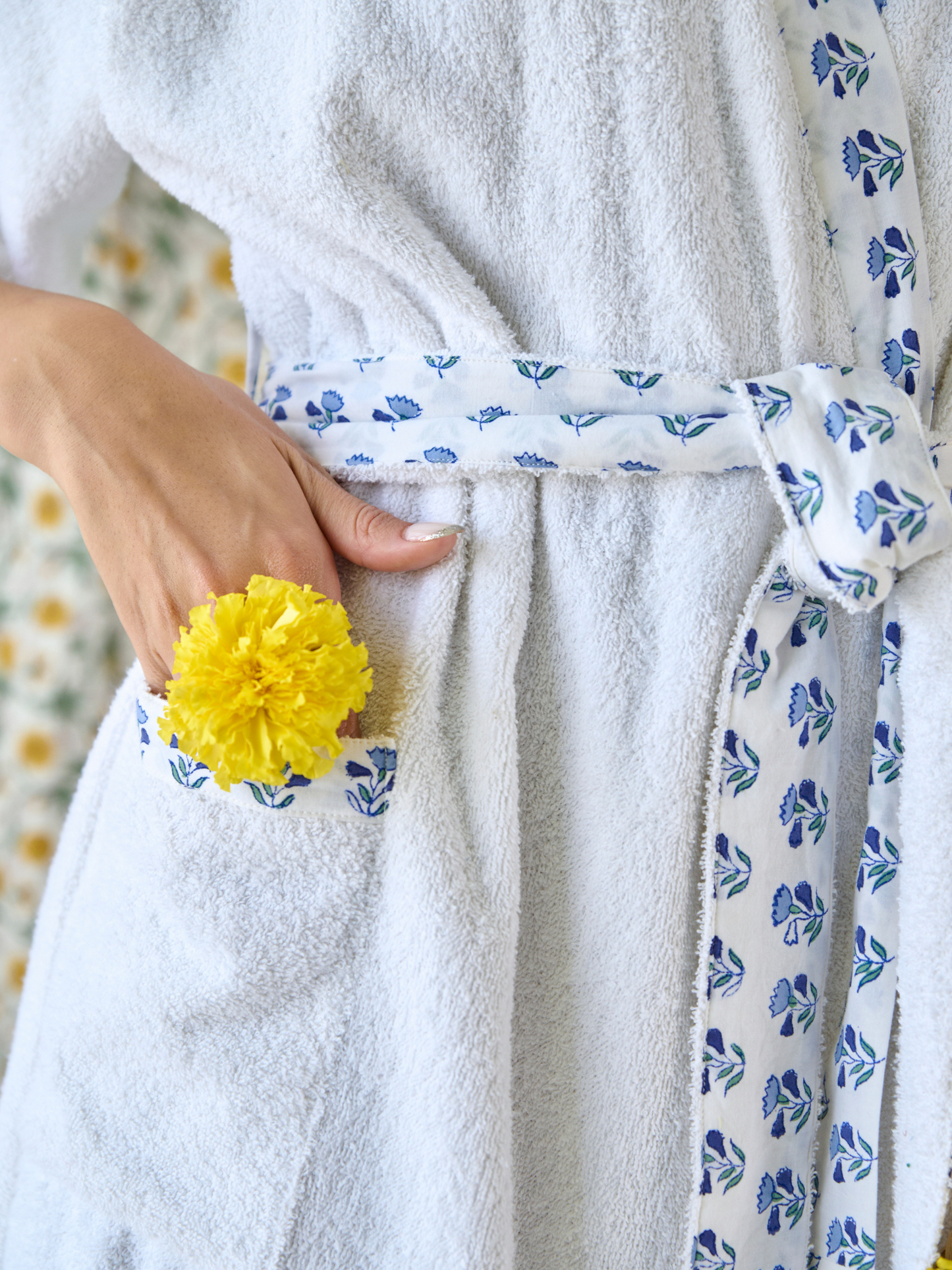 Our new towel dressing gown is our favourite gown yet! Jump straight out of the bath and wrap your self in this lovely organic cotton towel gown. We have added a block print trim around the waist, collar and pocket to add a little something different.
