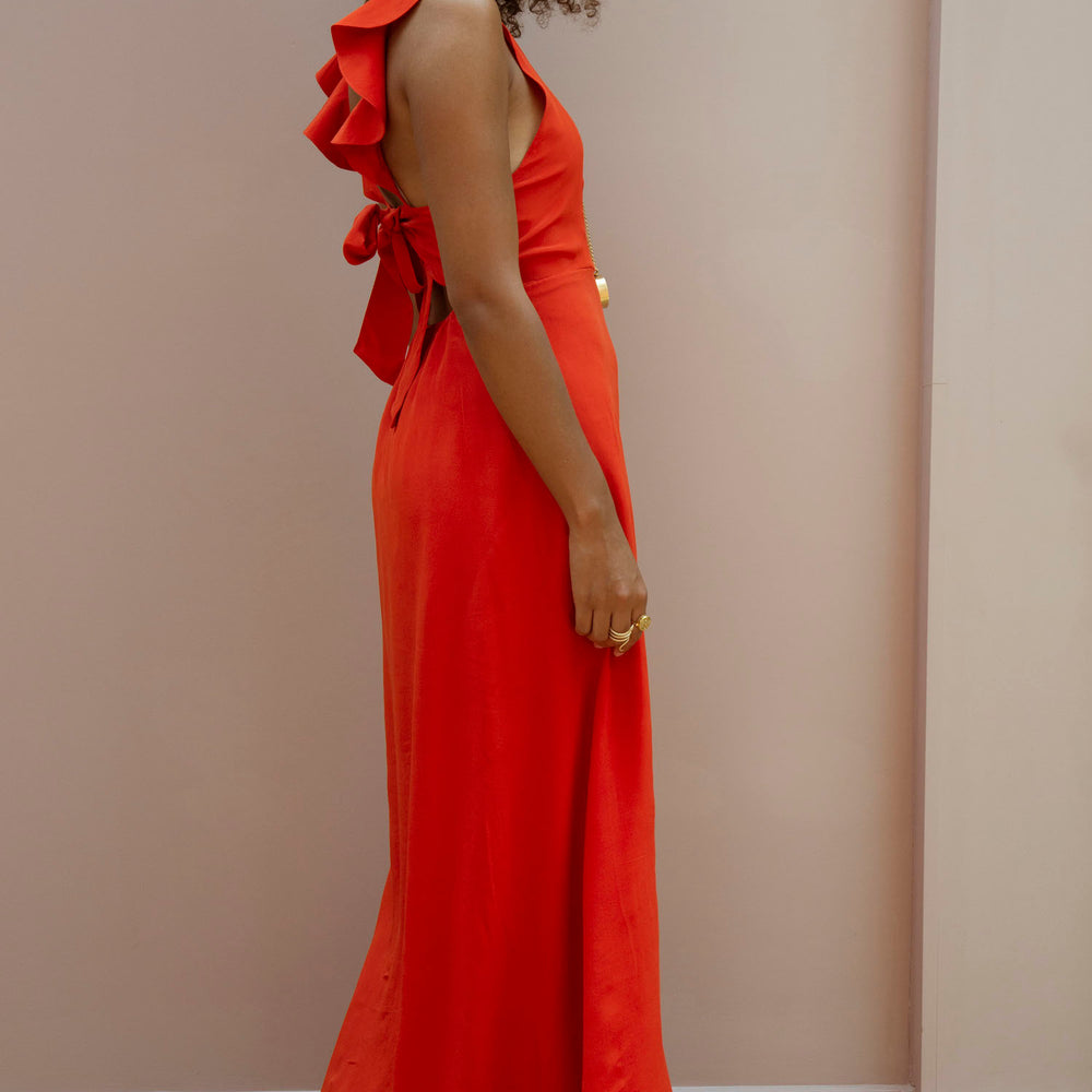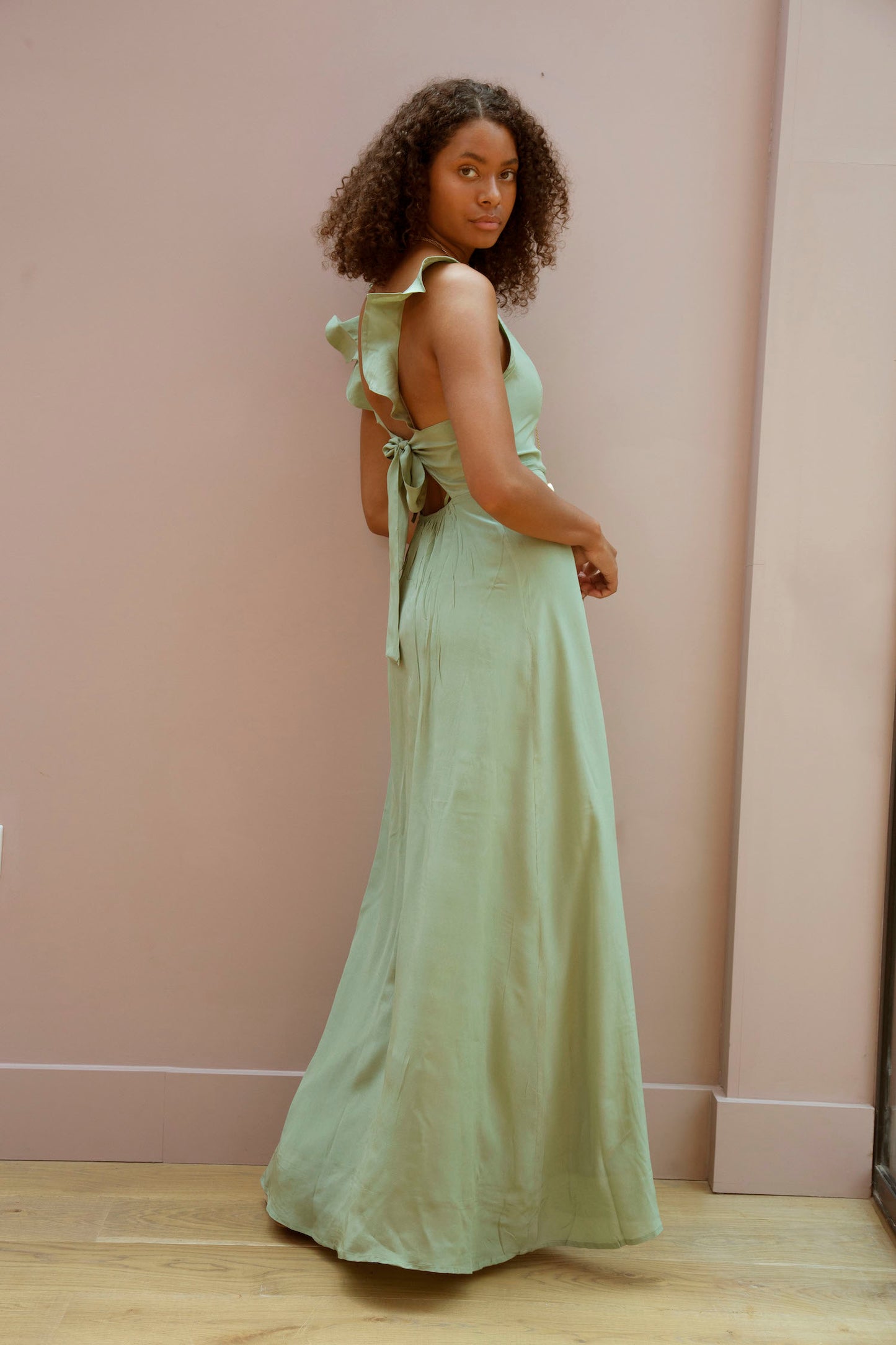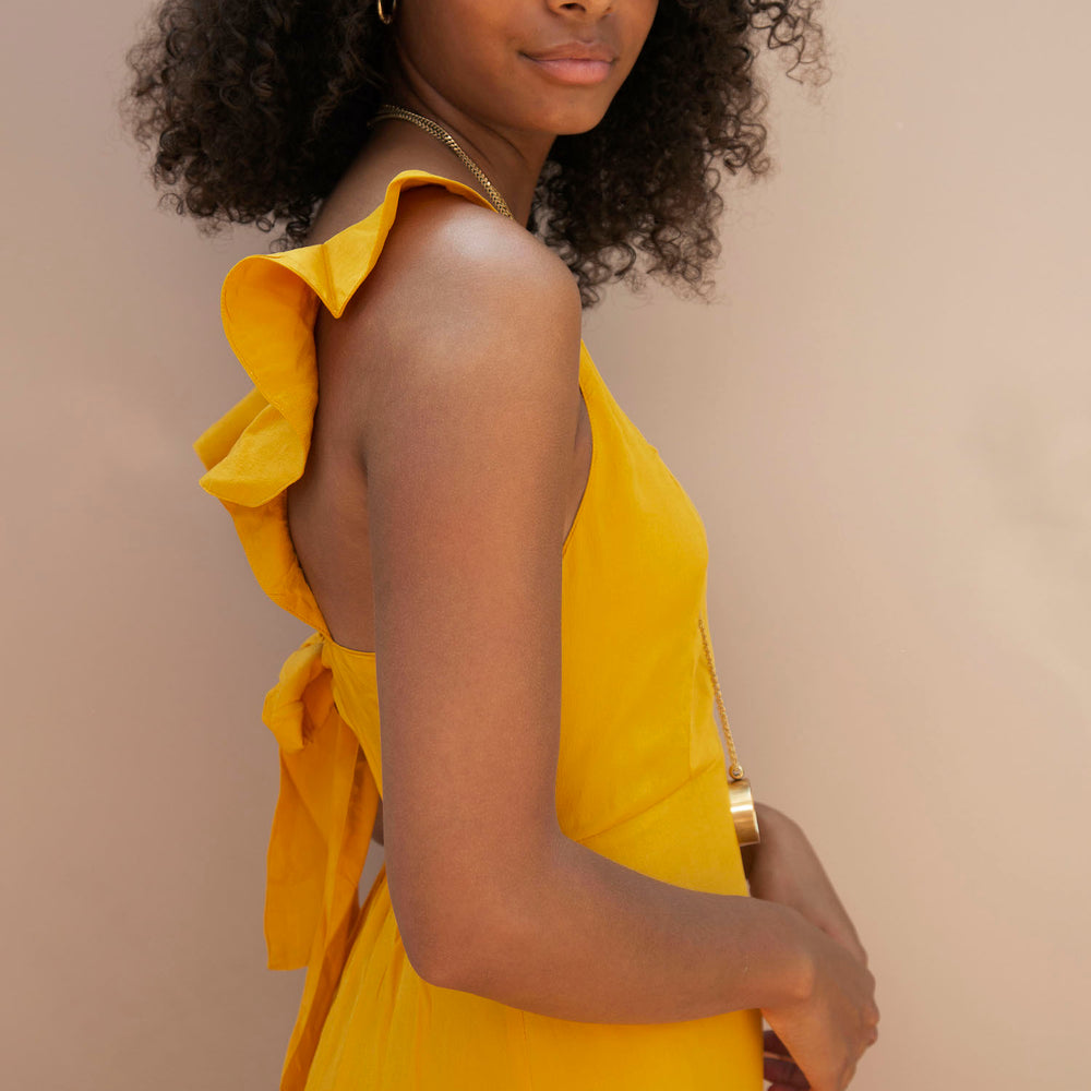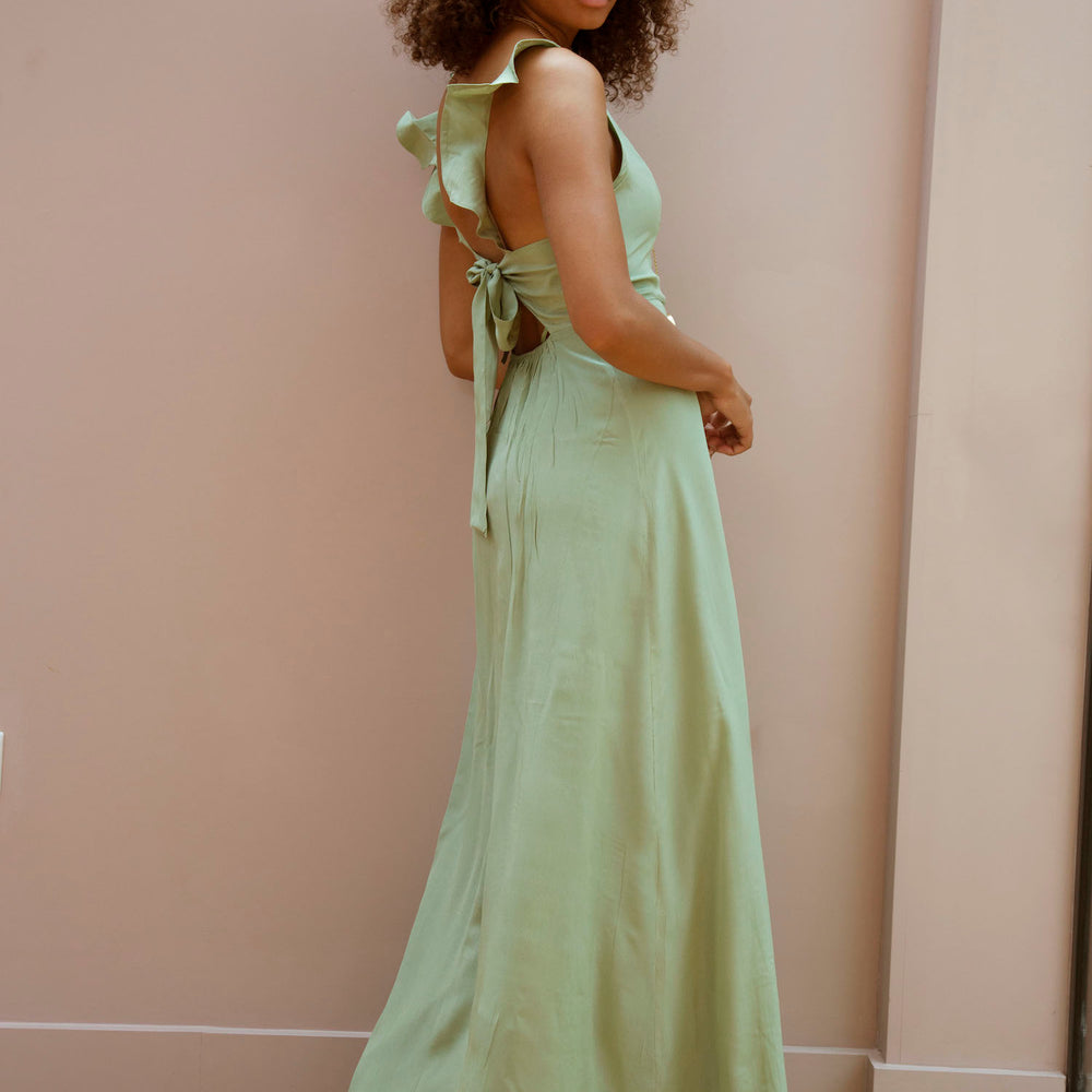 Our maxi dress has a simple front with ruffled straps and bow at back. The dress is made of a crepe silk that is sustainably grown in Northern India. Lolita is perfect for a Summer party, special event or even as a smarter holiday dress.